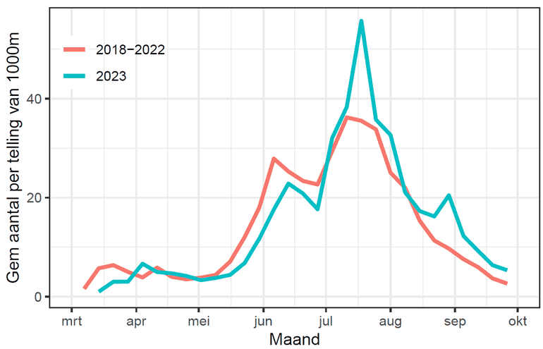 De vliegtijdgrafieken van het totaal aantal getelde hommels en die van de zes algemeenste hommelsoorten in Nederland laten zien dat de aantallen hommels begin 2023 vrij gemiddeld leken, maar vanaf begin mei lager bleven dan gemiddeld. De totale aantallen hommels in de eerste helft van 2023 bleven duidelijk achter bij het gemiddelde van de voorgaande jaren. De stijging van het aantal getelde hommels die we elk jaar in mei zien door de groei van de hommelvolken, startte duidelijk later dan in de meeste andere jaren. De aantallen in de voorjaarspiek bleven ook lager dan het gemiddelde. Ze waren vergelijkbaar met 2021 en 2022, maar opvallend lager dan de drie jaar daarvoor.