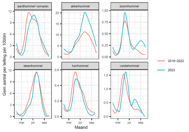 De vier andere algemene hommelsoorten: steenhommel, tuinhommel, weidehommel en aardhommelcomplex, laten allemaal de late stijging van de aantallen zien. Het duidelijkst zichtbaar was dit voor het aardhommelcomplex en de steenhommel. Het aardhommelcomplex en de steenhommel liepen in de eerste helft van het seizoen één tot twee weken achter op eerdere jaren. Hoewel de aantallen van het aardhommelcomplex in de zomer groter waren dan in 2022, is de verwachting dat 2023 een van de mindere jaren van het aardhommelcomplex was sinds de start van het meetnet. Ook de steenhommel bereikte weliswaar gemiddelde piekaantallen. Het vliegseizoen lijkt echter korter geweest dan normaal, dus de verwachting is dat het totale aantal steenhommels kleiner is.