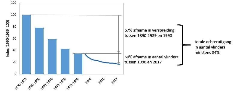 Tussen 1890 en 2017 is het aantal dagvlinders met minstens 84% achteruitgegaan, waarbij 15 soorten zelfs helemaal uit Nederland zijn verdwenen. Dit blijkt uit een analyse van langetermijngegevens (tot 127 jaar terug) door het Centraal Bureau voor de Statistiek (CBS) en De Vlinderstichting, gepubliceerd in het wetenschappelijk tijdschrift Biological Conservation.