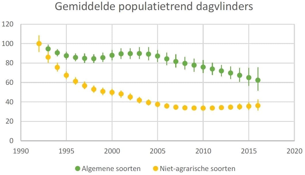 Dankzij het Landelijk Meetnet Vlinders hebben we in Nederland in elk geval voor één groep insecten betrouwbare informatie over populatietrends. Het algehele beeld bevestigt de in Duitsland geconstateerde achteruitgang in de hoeveelheid insecten. Onderzoek naar oorzaken van de waargenomen trends laat zien dat effecten van klimaatopwarming zichtbaar zijn, maar dat vooral de intensivering van het landgebruik de afname verklaart. De landbouw speelt daarin een doorslaggevende rol.