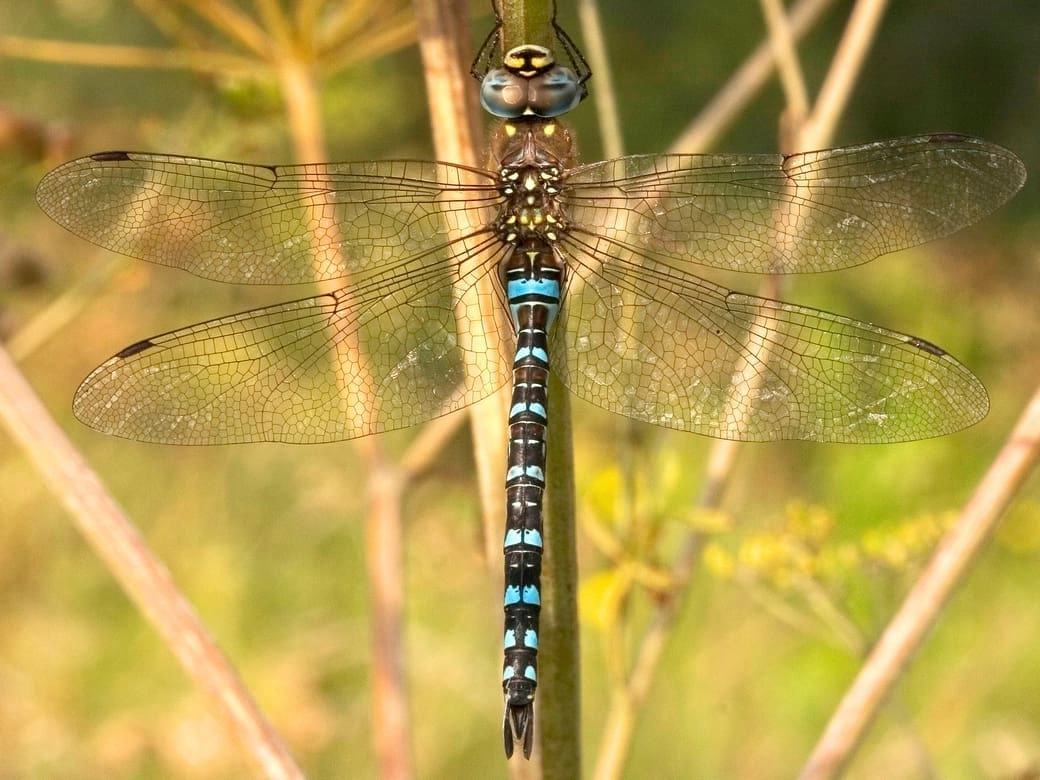 Er zijn, zo laat in het jaar, niet veel libellen meer. Een enkele steenrode of bruinrode heidelibel, paardenbijter of houtpantserjuffer kun je nog tegenkomen. En...