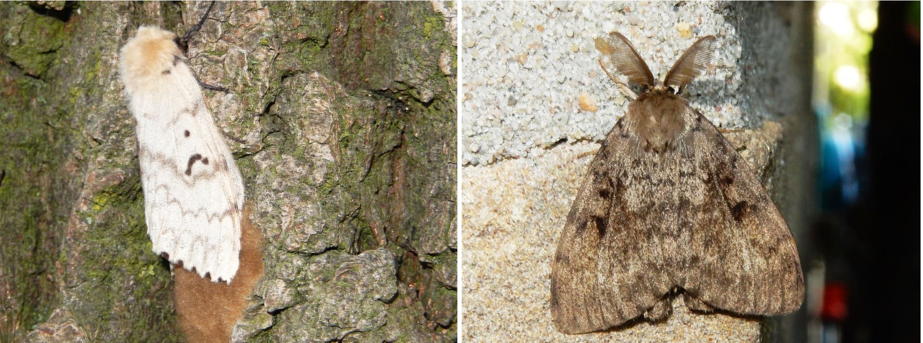 Op dit moment kun je bijvoorbeeld de rupsen van de plakker (Lymantria dispar) vinden. Die zitten ook vaak op eik, maar ook wel op allerlei andere bomen en struiken. De eikenprocessierups is echt aan zomereik gebonden. De plakker is een algemene nachtvlinder die verspreid in het land voorkomt. In de noordoostelijke provincies wordt deze soort echter minder waargenomen. Het is een vlinder van bossen, struwelen, parken en tuinen. De waardplanten, waarop de rupsen kunnen overleven, zijn diverse loofbomen, maar ook naaldbomen. Zomereik is wel favoriet en daarop kan de soort zelfs schadelijk zijn. Plakkers vliegen van half juni tot eind augustus in één generatie. De mannetjes komen af op licht, maar vliegen ook overdag. De vrouwtjes kunnen nauwelijks vliegen en blijven in de buurt van de cocon. Zo kunnen we ze nu dan ook aantreffen, in de tuin of op eiken langs de weg.