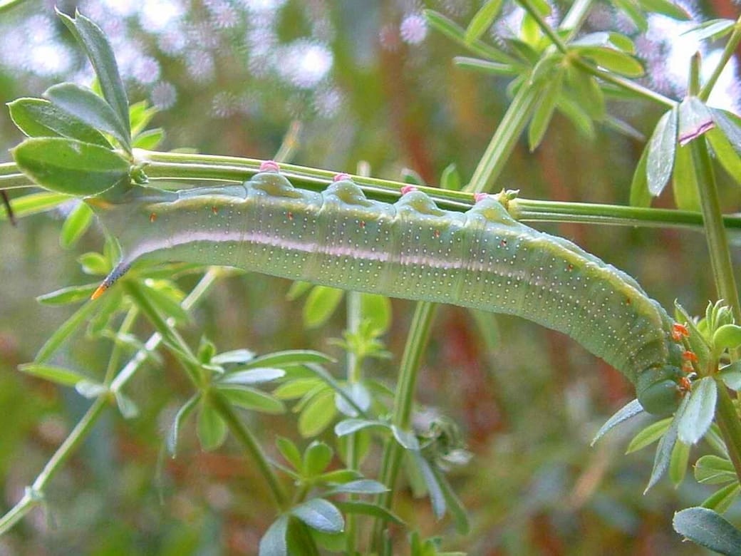 Uiteraard zorgen ze ook voor nageslacht, want dat is hun belangrijkste taak in het leven. Na de paring gaan de vrouwtjes op zoek naar planten waarop ze hun eitjes afzetten. De rupsen leven van diverse walstrosoorten en daarop worden dan ook de eitjes afgezet. Dat gaat om een heel gewone soort als glad walstro. De rupsen zijn te vinden vanaf mei (maar dan zijn ze nog klein) tot in augustus. Nu zijn de rupsen groot en is de trefkans het grootst. De kolibrievlinder hoort bij de pijlstaarten en de overwegend groene rups heeft dan ook het kenmerkende pijltje op het achterste deel.