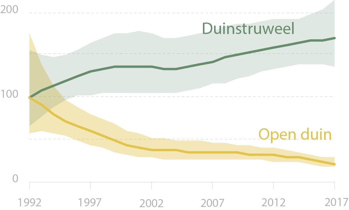 Aantal vlindersoorten van open duinen en opgaande struwelen (1992-2017). De lijn geeft de gemiddelde trend, met een startwaarde van 100 procent in 1992. De gekleurde zone eromheen geeft de onzekerheid. Voor duinvlinders gaat het om acht soorten, voor struweelsoorten om tien soorten. (Bron: Netwerk Ecologische Monitoring)