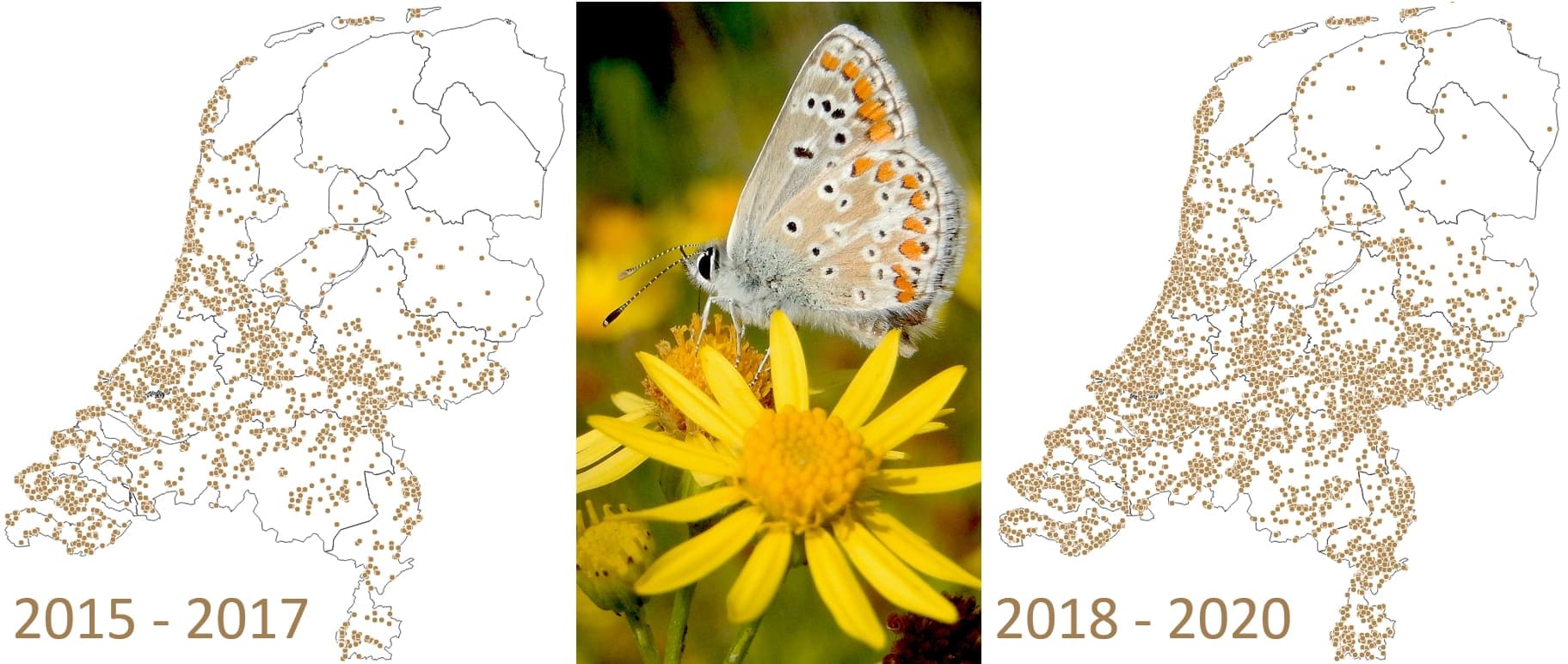 Een vreemde naam, bruin blauwtje, en een ‘contradictio in terminis’, maar hij heet echt zo. Dat komt omdat de vlinder hoort bij de familie van de blauwtjes en dus, net als het boomblauwtje of het heideblauwtje, die familienaam draagt. In tegenstelling tot veel andere blauwtjes waarvan de mannetjes ook echt blauw zijn is bij het bruin blauwtje zowel het mannetje als het vrouwtje bruin. Het bruin blauwtje is een vrij schaarse standvlinder die van oudsher vooral voorkwam in de duinen, en in lagere dichtheden in het westen van het land, het rivierengebied en Zuid-Limburg. Recentelijk heeft deze vlinder zich verder uitgebreid, waardoor hij nu verspreid over grote delen van Nederland voorkomt. Alleen in de drie noordelijke provincies komt hij (nog) minder voor. Overigens zijn de dichtheden in de duinen wel flink lager dan dertig jaar geleden. We zien de uitbreiding waarover gesproken wordt de laatste jaren versterkt terug.
