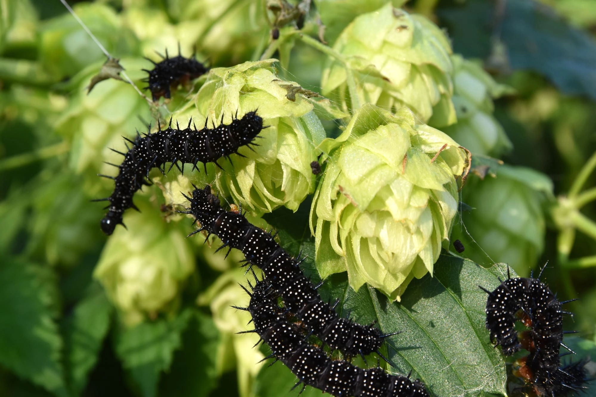 De melding van Sandra Harthoorn betrof namelijk rupsen op Hop (Humulus lupulus). En dat is ongebruikelijk. Rupsen van de dagpauwoog leven namelijk bijna uitsluitend op Grote brandnetel. Na wat zoeken bleek dat het bij Butterfly Conservation (de Engelse Vlinderstichting) op de website staat: Common Nettle (Urtica dioica), although eggs and larvae are occasionally reported on Small Nettle (U. urens) and Hop (Humulus lupulus).