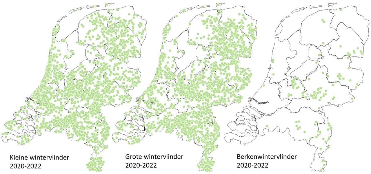 De andere wintervlinders hebben een vergelijkbare ontwikkeling. De grote wintervlinder komt ook verspreid door het hele land voor en op het kaartje lijkt deze bijna even algemeen als de kleine wintervlinder. Maar in de NDFF zitten van deze soort vanaf 2020 maar 5000 waarnemingen van 10.800 vlinders, dus minder waarnemingen en een gemiddelde van twee vlinders per waarneming. Grote wintervlinder vind je dan ook niet vaak in flinke aantallen bijeen, behalve als ze worden aangelokt met een lichtbron.