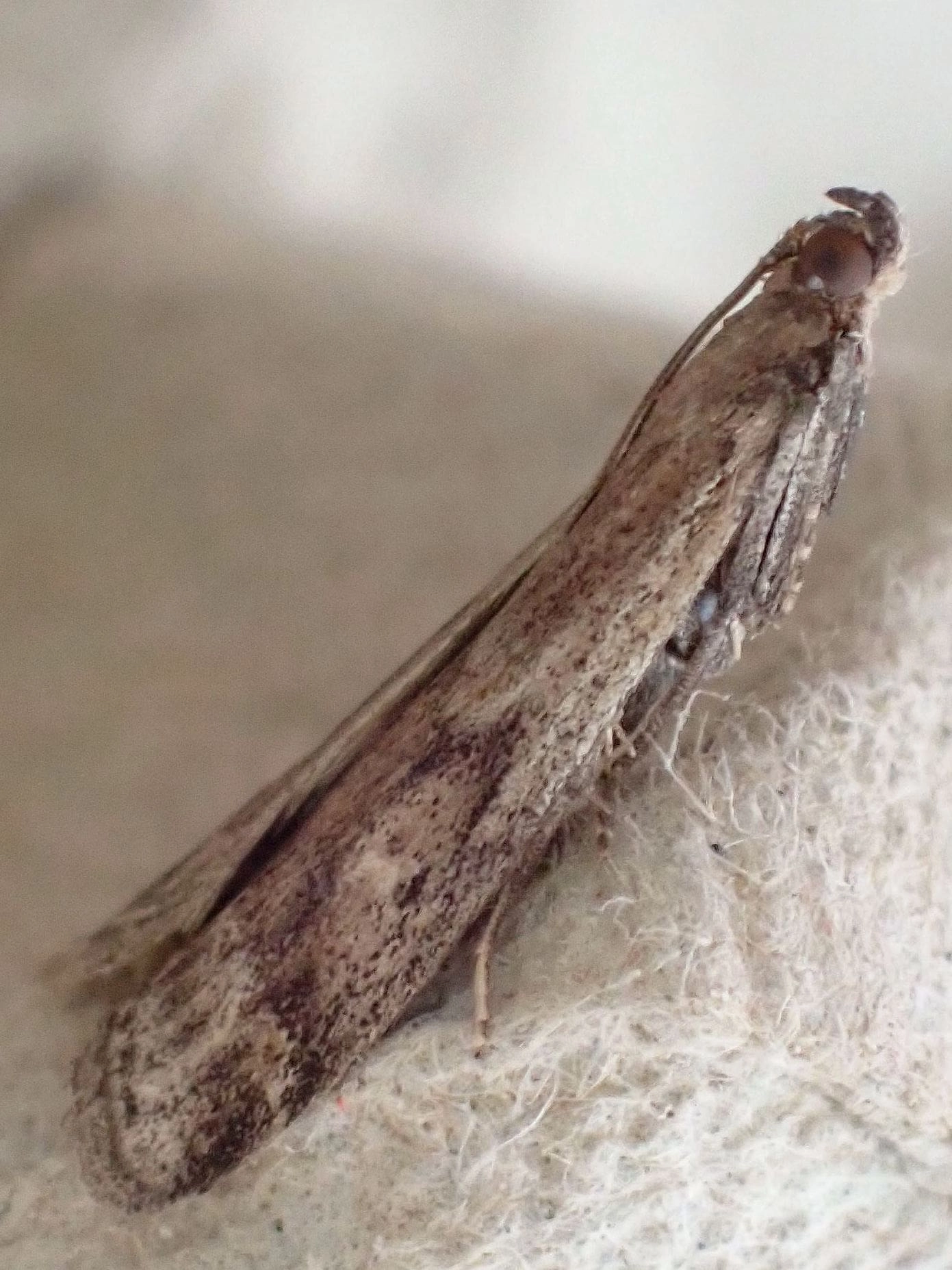 Het lijkt een rustige avond te gaan worden. Op de smeer zit geen enkele vlinder en op het laken is het ook rustig. De grootste wens van de deelnemers deze avond is het verschijnen van een blauw weeskind (Catocala fraxini). Maar ook die laat zich niet zien. Nou ja, het is tenslotte ook al het einde van het seizoen. Toch blijft het opletten geblazen, want er verschijnen geregeld nieuwe exemplaren en voor de avond nieuwe soorten op het laken. Op een gegeven moment zit er een opvallend getekend en klein snuituiltje op het laken. Niemand weet wat het is en ook afbeeldingen in de meegenomen nachtvlindergids bieden geen soelaas.
