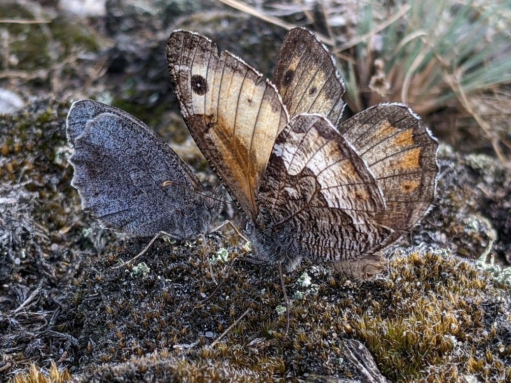 Tot zijn verbazing was deze kleine heivlinder aan het ‘flirten’ met een ‘gewone’ heivlinder, een soort die nog tamelijk algemeen is op de Veluwe. Uiteindelijk vond er zelfs een paring plaats tussen de twee vlinders: de gewone heivlinder had een vrouwtje kleine heivlinder aan de haak geslagen. Bijzonder om te zien, maar natuurlijk slecht nieuws. Deze copulatie zal geen nakomelingen voortbrengen, en de kans is heel klein dat dit vrouwtje kleine heivlinder, een van de allerlaatste, na deze paring alsnog een mannetje kleine heivlinder vindt en opnieuw zal paren.
