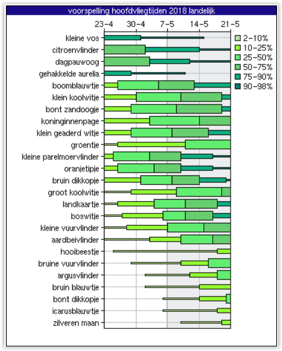 Boomblauwtje, bont zandoogje, klein koolwitje en klein geaderd witje zullen de piek in hun voorjaarsgeneratie bereiken. Ook voor het oranjetipje valt de piek de komende tijd, maar deze heeft maar één generatie per jaar en zal de rest van het jaar dus niet meer als vlinder worden gezien. Groot koolwitje, landkaartje, kleine vuurvlinder en groentje zijn al aanwezig, maar de piek in hun vliegtijd wordt nu rond 10 mei verwacht. Die verwachting wordt regelmatig bijgesteld op grond van de temperatuur en de hoeveelheid zonuren. Klik hier voor de meest actuele vliegtijdverwachting voor dagvlinders.