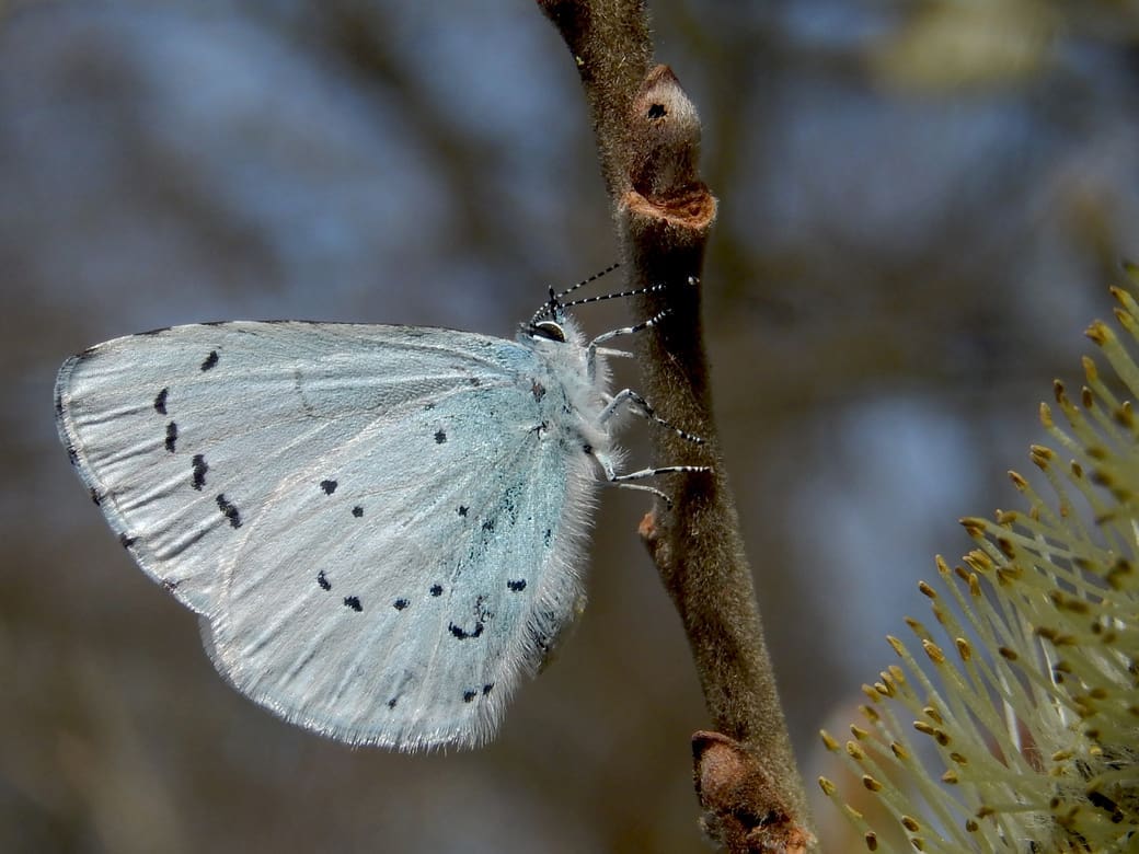 Het boomblauwtje is gelukkig geen zeldzaamheid. Je ziet ze uiteraard minder dan de zeer talrijke koolwitjes en ze zitten minder op nectarplanten zoals de dagpauwoog, die daar goed te bekijken is, maar overal waar bomen of struiken zijn in Nederland kun je ze aantreffen, ook en in het voorjaar misschien wel juist, in tuinen. Ze vliegen veel en je moet er dan ook een beetje op gespitst zijn om ze te zien. Je hoeft ze niet van dichtbij te zien om ze op naam te brengen, want als je nu, zo vroeg in het voorjaar, een blauwtje ziet is het vast en zeker boomblauwtje. Als dit ook nog middenin een stad of dorp is dan kan het helemaal niet anders, want andere soorten blauwtjes kom je daar niet tegen. De eerste zijn vorige week gemeld en de komende weken zullen er nog veel uit de pop komen en te zien zijn. Mannetjes patrouilleren op zoek naar vrouwtjes en vrouwtjes gaan, na de paring, op zoek naar plekken om hun eitjes af te zetten.