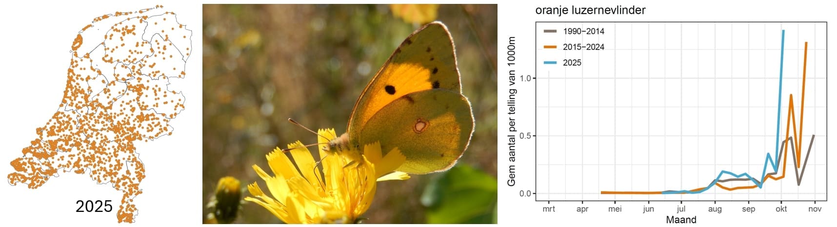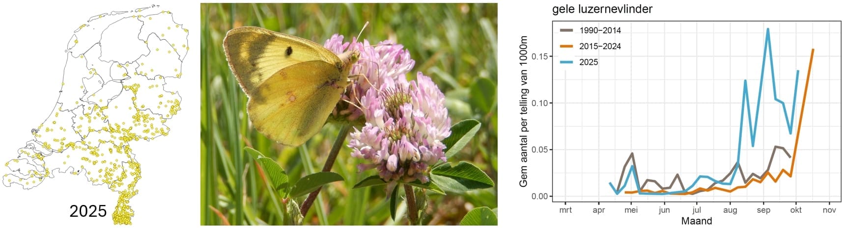 2025 is een goed jaar voor twee trekvlinders: de gele en de oranje luzernevlinder. Deze komen in het voorjaar vanuit het zuiden naar ons land en planten zich hier voort. Hun nakomelingen kunnen als rups (nog) niet in Nederland overwinteren. Daarom trekken ze als vlinder in de nazomer weg naar zuidelijker streken en komt een nieuwe generatie iedere voorjaar terug. Hoeveel? Dat is wisselend.