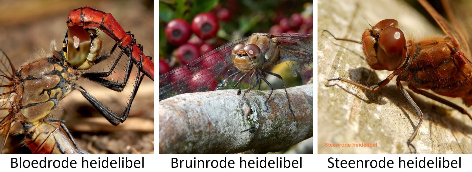 Om ze op naam te brengen zijn er een paar kenmerken waarop je moet letten. De bloedrode heidelibel heeft helemaal zwarte poten en is daar goed aan te herkennen. De bruinrode en steenrode hebben lichte bruinige of gelige strepen over de poten. Wil je deze twee uit elkaar houden, dan is de snor van belang. De snor is zwart en zit direct onder de ogen. Bij de steenrode heidelibel is het een hangsnor, die aan weerszijden van de snuit naar beneden doorloopt. Bij de bruinrode zit het zwart alleen boven de snuit.