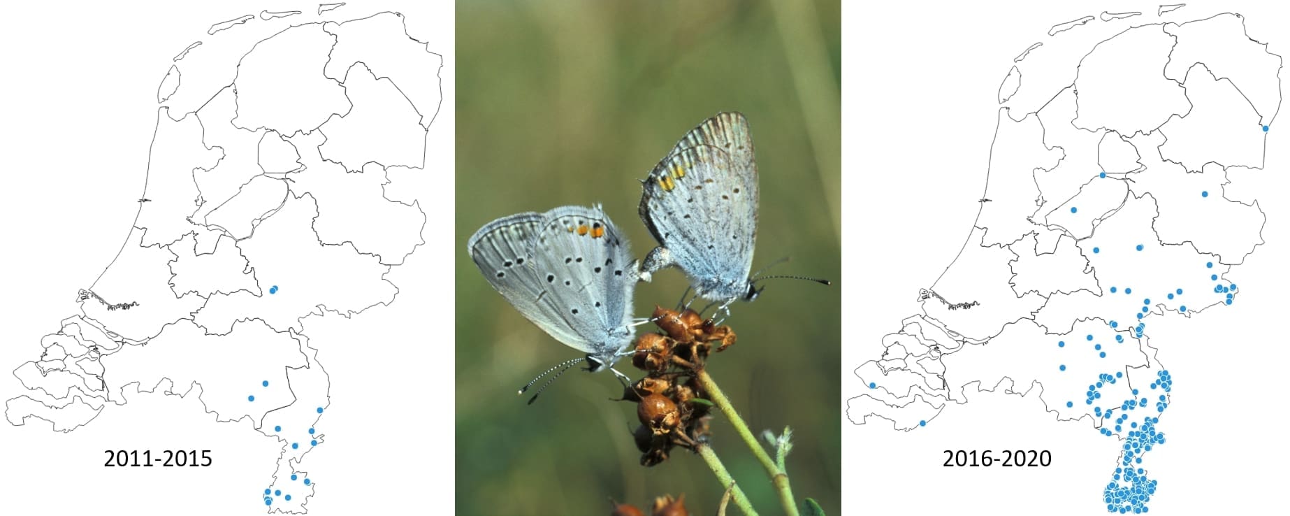 Uit 2020 zijn er meldingen van staartblauwtjes uit meer dan honderd kilometerhokken. Vrijwel alle vindplaatsen liggen in het oosten van het land, de meeste in Limburg, maar ook in Noord-Brabant en Gelderland is de soort gezien. Op veel plekken is ook waargenomen dat er eitjes zijn afgezet en is dus voortplanting vastgesteld. Het staartblauwtje vliegt in twee of drie generaties van april tot in oktober en kan zich daardoor vrij snel uitbreiden. Het staartblauwtje is, behalve aan het staartje, dat snel afbreekt en dan dus niet meer aanwezig is, goed te herkennen aan de twee oranje vlekken op de onderkant van de achtervleugel. Het erop lijkende icarusblauwtje heeft veel meer oranje op de onderzijde. Bij oude staartblauwtjes is het oranje soms bijna onzichtbaar en dan heeft de vlinder wel wat weg van een boomblauwtje. Probeer, als u er over een poosje een tegenkomt, een foto te maken. Zelfs een klein en niet helemaal scherp plaatje zal voldoende zijn voor determinatie.