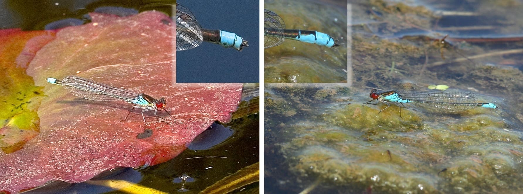 Het belangrijkste kenmerk is de hoeveelheid blauw op de achterste segmenten van het achterlijf. Bij de grote roodoogjuffer zijn de achterste twee blauw, bij de kleine is ook de hele onderkant van het derde segment van achteren blauw. Je denkt dat zo’n klein kenmerk op zo’n kleine juffer die ergens op meters afstand op het water zit niet is te zien, maar dat valt reuze mee. Doordat je de juffer van opzij ziet kun je, zeker met een verrekijker, dat blauw op de achterste segmenten prima onderscheiden. Want beide roodoogjuffers vind je niet veel in de oevervegetatie, maar ze zitten vaak op waterplanten, soms meters uit de kant. Hierbij is er nog een belangrijk verschil, wat al aanwijzingen geeft over met welke je te maken hebt. De grote roodoogjuffer, die je dus nu kunt zien, zit vaak op de bladen van drijvende waterplanten als gele plomp en waterlelie. De kleine zit meer op ondergedoken waterplanten als gedoornd hoornblad of op flab, die groene matten met drijvende draadalgen.