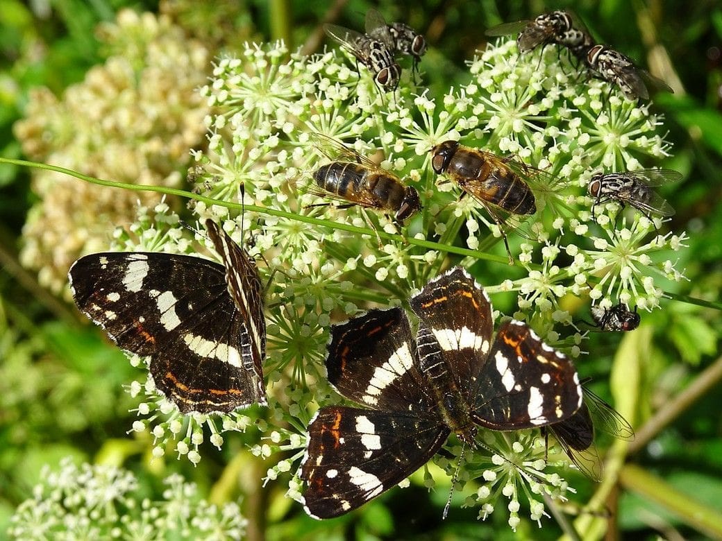 De rupsen zijn specialisten en eten alleen maar brandnetel. De vlinders zelf zijn minder kieskeurig. Ze drinken uit allerlei bloeiende planten om nectar te verzamelen. Die nectar is de brandstof waardoor ze actief kunnen zijn, kunnen vliegen en zich kunnen voortplanten. Hoewel ze uit allerlei planten kunnen drinken, zien we bij landkaartje wel een voorkeur voor witte schermbloemigen. Dat is extra bijzonder omdat hier nauwelijks andere dagvlinders gebruik van maken. Het zijn wel aantrekkelijke planten voor zweefvliegen en kevers, maar niet voor dagvlinders. De voorjaarsgeneratie kun je zien drinken op fluitenkruid. De vlinders in juli moeten een andere plant kiezen, want fluitenkruid bloeit dan niet meer. De zomergeneratie schakelt moeiteloos over op berenklauw, een witte schermbloemige die juist in de zomer bloeit.