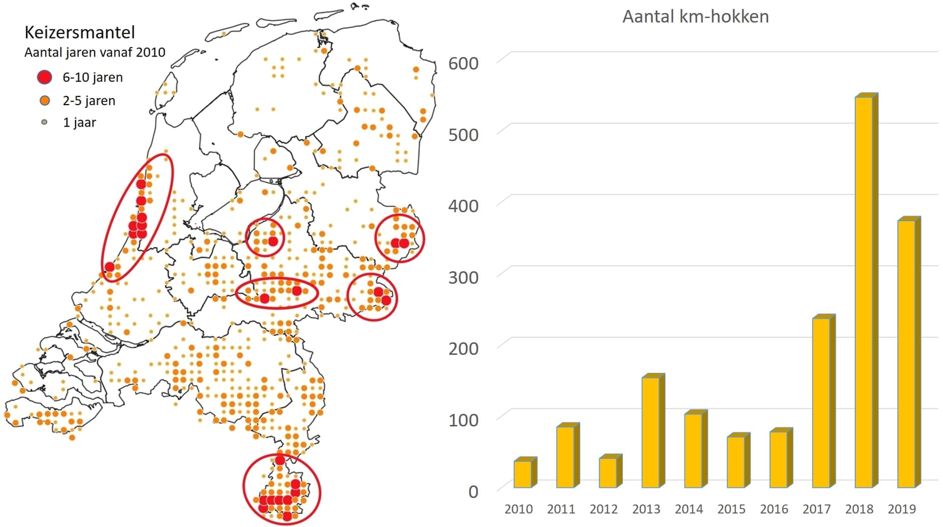 Vanaf 2010 neemt het aantal waarnemingen sterk toe en nu zijn er ook gebieden waar de soort zich jaar in jaar uit voortplant. Op het kaartje zijn zeker zes gebieden te onderscheiden waar sprake is van populaties. De duinen zijn erg goede vliegplaatsen waar soms enorme aantallen worden gezien, zowel in Noord-, als in Zuid-Hollandse duingebieden. Uit Meyendel, bij Den haag, komen heel veel meldingen. Midden in dit duingebied, waar erg veel wordt gewandeld, ligt een bezoekerscentrum en een pannenkoekenhuis en daar staan ook een aantal vlinderstuiken. De keizersmantels die zich in de omgeving voortplanten komen graag drinken op die vlinderstruiken en zijn dan goed te bekijken en fotograferen. Je kunt, bij wijze van spreken, vanachter je gember-kaaspannenkoek van ze genieten. In het binnenland zijn er vijf gebieden waar zekere voortplanting plaatsvindt. In Zuid-Limburg, aan de Zuidrand van de Veluwe, bij Elspeet op de Noordelijke Veluwe, in Twente en in de Achterhoek. De sterke toename van de keizersmantel van de laatste jaren is waarschijnlijk vooral te danken aan de klimaatverandering, waardoor de omstandigheden hier geschikter worden. We zijn benieuwd of de grote aantallen, zoals nu bijvoorbeeld in de duinen worden geteld, ook de komende jaren nog aanwezig zullen zijn.