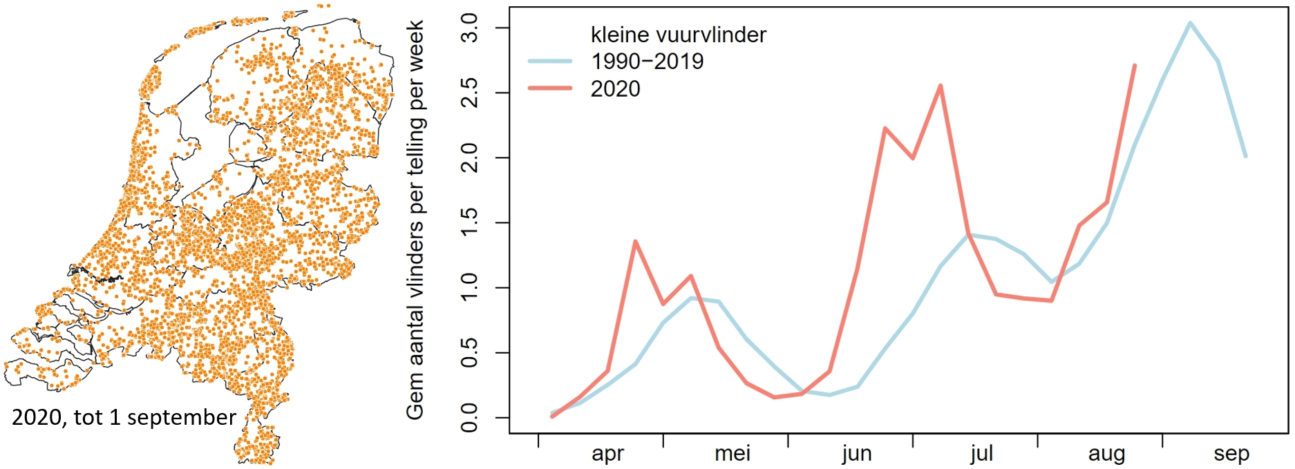 Ook de kleine vuurvlinder was het hele jaar al veel te zien. Bij deze vlinder is vaak de derde generatie, die vanaf eind augustus tevoorschijn komt, de grootste. Ook dit jaar lijkt dat het geval, want er worden er nu al veel gemeld op Waarneming.nl en Telmee. De kleine vuurvlinder is een echte graslandvlinder, die in het hele land voorkomt op bloemrijke plekken.