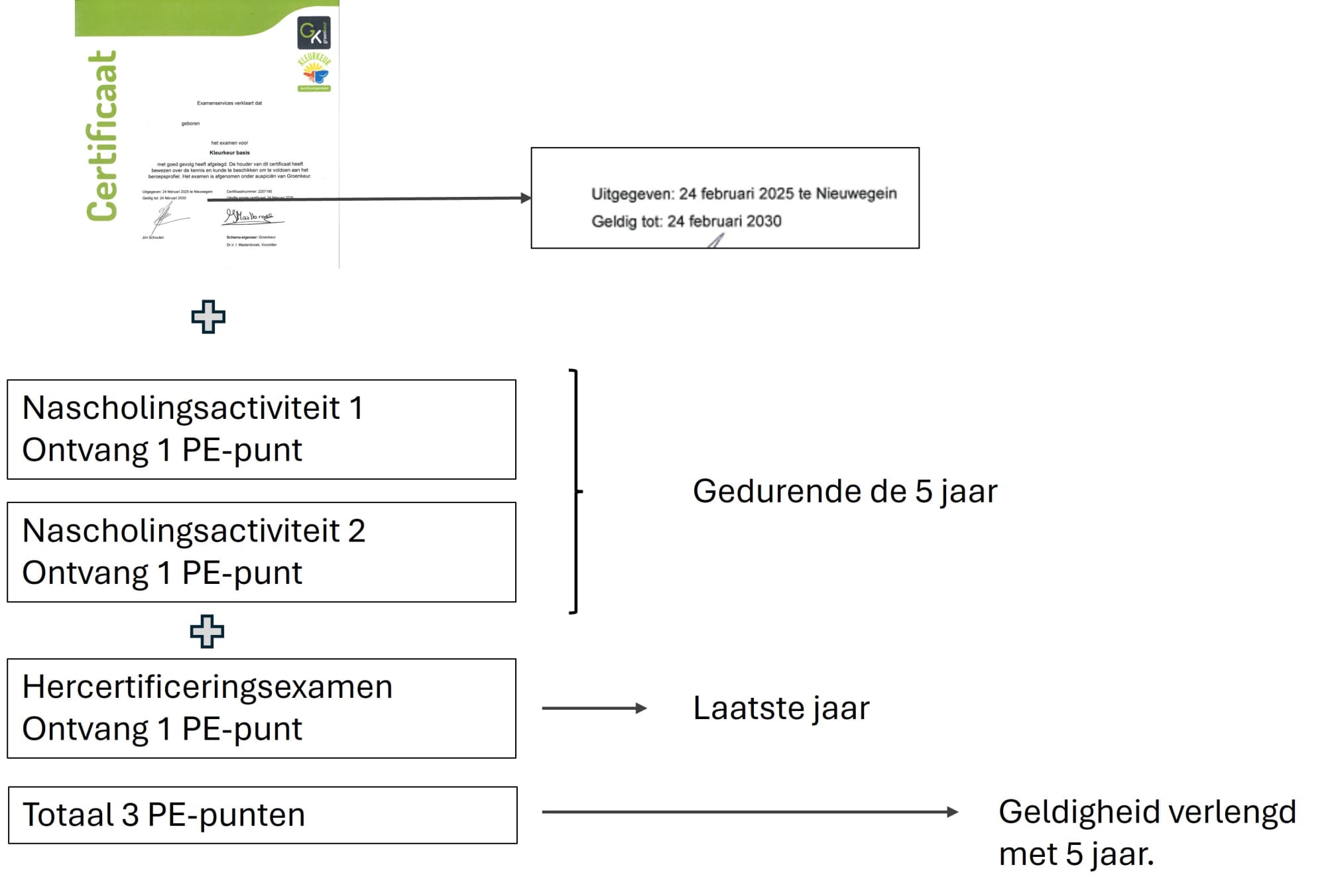 Eén PE bijeenkomst, die minimaal 3 uur moet zijn, levert u 1 van de 3 benodigde punten op. Het derde punt behaalt u door het examen voor hercertificering te doen. (In het geval de deelnemer beschikt over zowel het certificaat Kleurkeur Basis als Kleurkeur Gevorderde, hoeft u alleen een examen Gevorderde voor her-certificering te doen). Opnieuw cursus volgen hoeft niet, maar mag natuurlijk wel. Het examen voor behoud van uw certificaat kunt u aanvragen op de website van Groene Erkenningen.