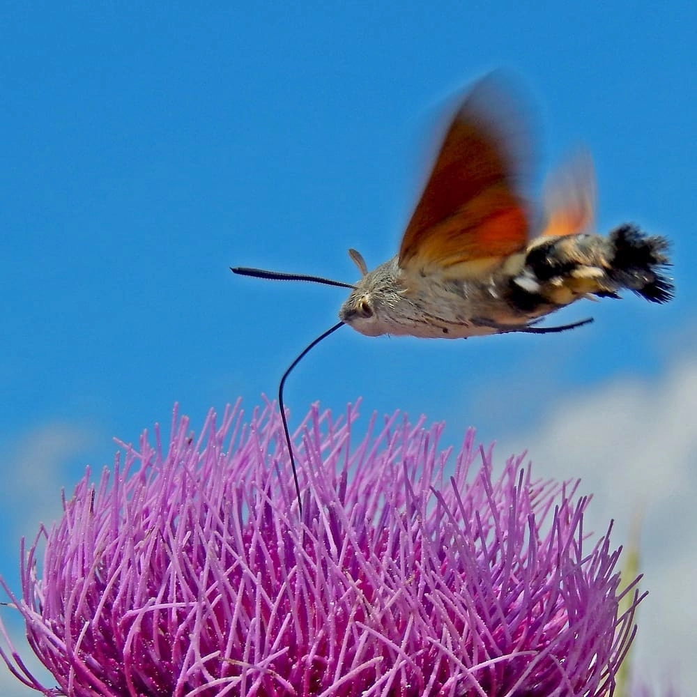 De kolibrievlinder stelt dezelfde acrobatiek tentoon. Als je je tenminste rustig houdt, want ze zijn erg schuw. Eén te snelle handbeweging en hup, daar gaat hij. Om ze te goed te kunnen fotograferen moet je engelengeduld hebben. In de zomer worden ze vaak op de vlinderstruik gefotografeerd. Het nadeel is dat er op de foto meer struik dan vlinder te zien is. Nee, als je ze mooi wilt kieken, dan moet je bij flox of nog mooier, bij slangenkruid op wacht gaan zitten.