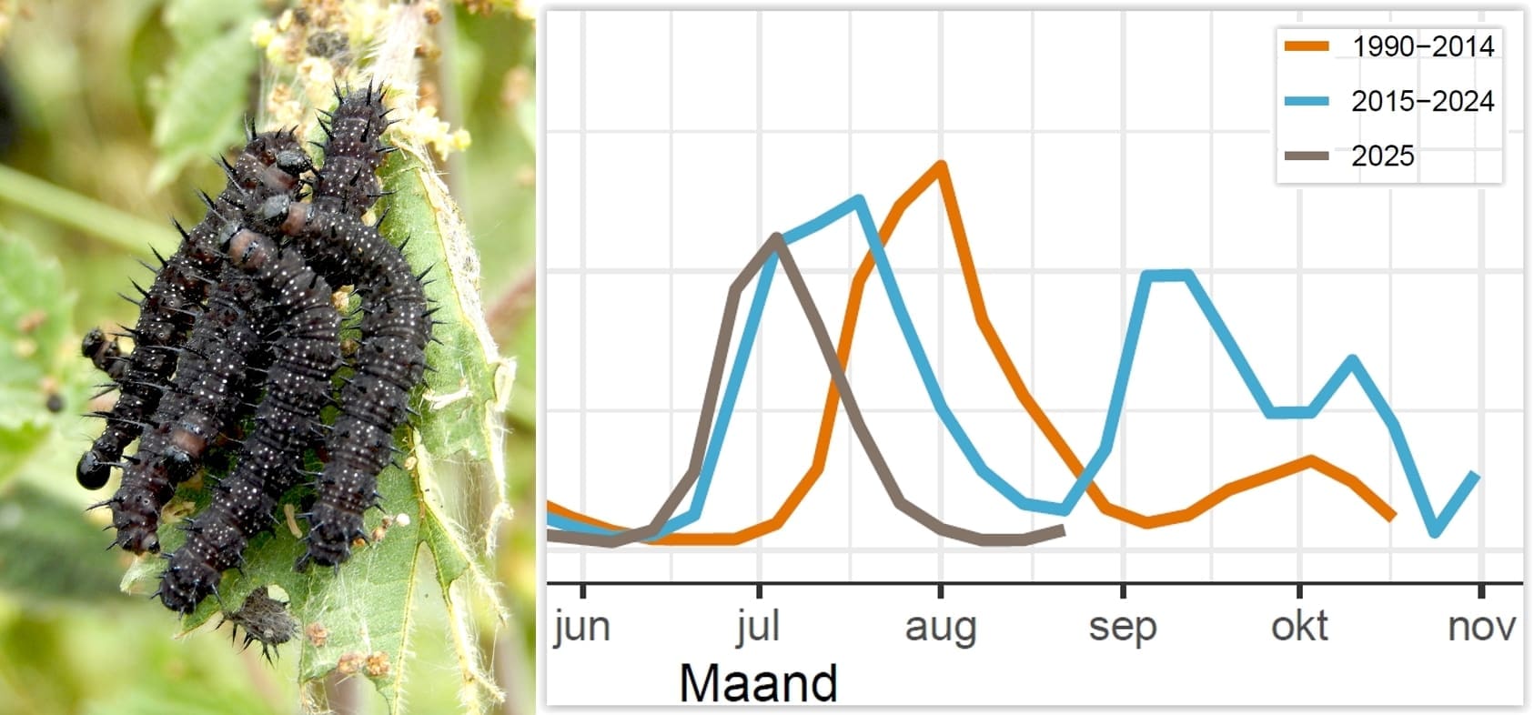 We zien bij meer soorten dat er extra generaties komen. Vorig jaar leidde die extra voortplanting tot enorme aantallen. Dat had te maken met de kwaliteit van hun waardplant, de brandnetel. 2024 was een vochtig jaar en in augustus stonden de brandnetels er nog steeds vitaal bij, ideaal voedsel dus voor de duizenden rupsen van dagpauwoog.