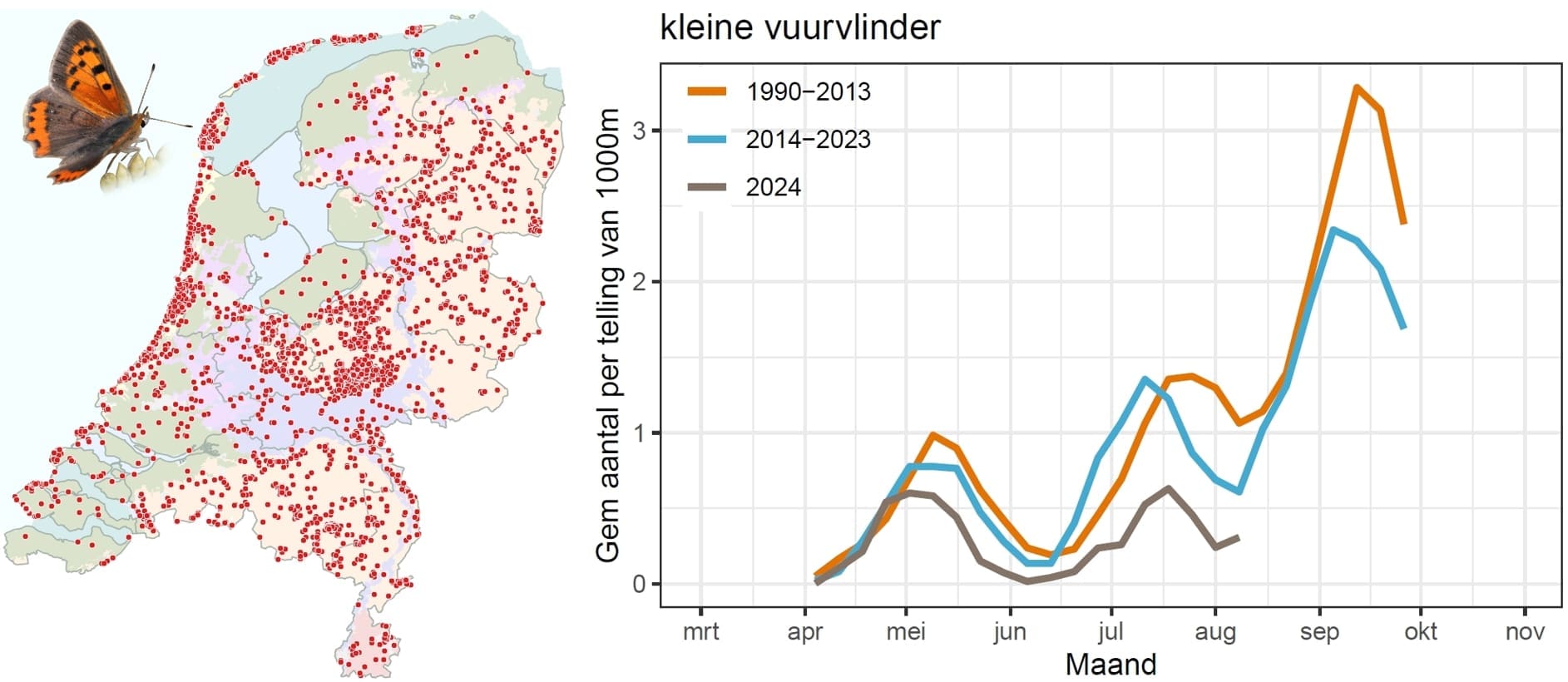 De eerste kleine vuurvlinders vliegen in mei, de tweede generatie vliegt in juli. In beide perioden waren in 2024 de aantallen laag, veel lager dan het gemiddelde van de afgelopen dertig jaar. Of dit komt door het sombere en natte voorjaar is niet zeker, ook andere zaken kunnen een rol spelen. De septembergeneratie in 2023 was min of meer normaal. Deze vlinders hebben eitjes afgezet, waaruit nog datzelfde najaar de rupsen zijn verschenen. Deze hebben, half volgroeid, overwinterd in de strooisellaag. In het voorjaar zijn de rupsen verpopt en kwamen de vlinders van de eerste generatie tevoorschijn. De nakomelingen van deze voorjaarsgeneratie bleven in 2024 in aantal fors achter bij het gemiddelde. In de zomer was ongeveer de helft van het normale aantal aanwezig.