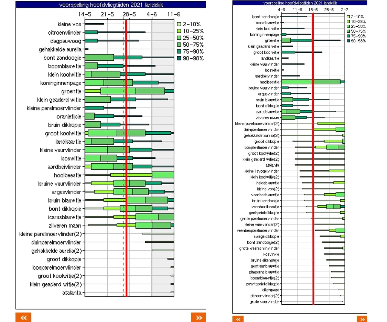 De Vlinderstichting heeft een tool die een verwachting geeft van de vliegtijd van de vlinders. Die inschatting wordt gemaakt door de temperatuursom van de afgelopen tijd en een negendaagse weersvoorspelling, waarbij verwachte temperatuur en straling worden meegenomen in de berekeningen. Als we deze voorspelling nu, rond 27 mei, bekijken zien we dat flink wat vlinders zijn met dikke balken, dat wil zeggen, vlinders die nu in de top van hun vliegtijd zijn. Bekijken we de situatie rond 18 juni dan is er alleen een dikkere balk is bij het hooibeestje. Alle andere vlinders zijn dan of op het eind van hun vliegtijd of zijn nog niet verschenen. Uiteraard zullen deze verwachtingen dagelijks veranderen. Een flinke warme zonnige periode kan betekenen dat er een aantal vlinders toch volop vliegen half juni. We zijn benieuwd!