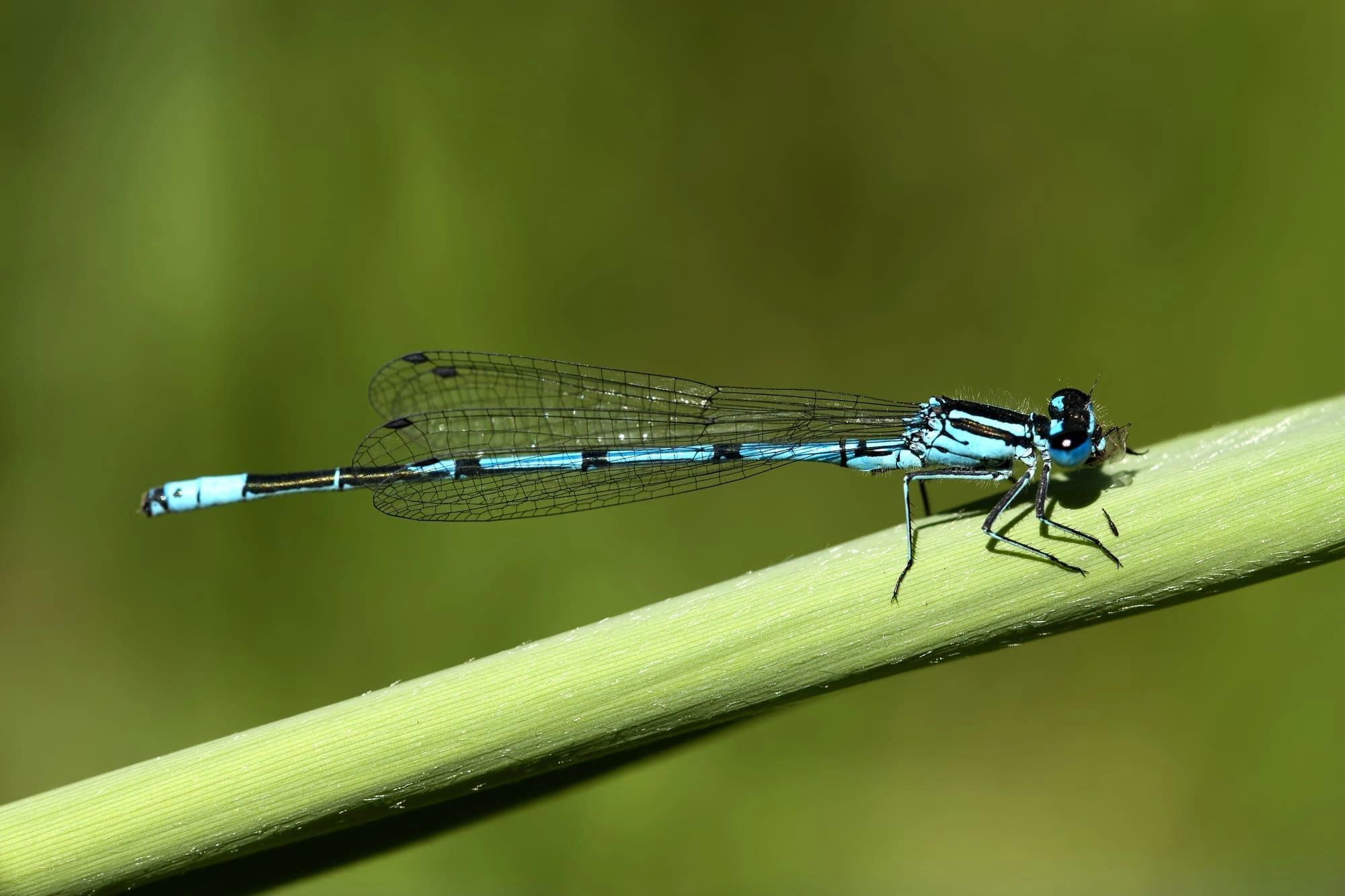 Lengte: 33-35 mm. Slanke waterjuffers. - Mannetje: lichter en uitgebreider blauw dan andere waterjuffers. Op segment twee staat doorgaans een U-vormige zwarte tekening, die niet is verbonden met de achterrand. De zwarte stukjes op segmenten 3, 4, en 5 (bovenaanzicht) zijn zeer kort, ongeveer een vijfde van de segmentlengte. Hierdoor komt het middengedeelte van het achterlijf zeer blauw over, met een regelmatig patroon van zwarte vlekjes. Segment 6 voor ca. de helft zwart, segment 7 vrijwel geheel. Segmenten 8 en 9 grotendeels blauw. Aan de zijkant van het achterlijf lopen de zwarte vlekken uit in een smalle streep richting de voorrand van de segmenten. Schouderstrepen normaal ontwikkeld. - Vrouwtje: lichte delen groen tot blauw. Meestal met (vrijwel) geheel donkere achterlijfsrug. Er bestaat ook een vorm met blauwe vlekken op segmenten 2 tot en met 5. Mannetje: achterrand halsschild golvend, met breed afgerond middendeel. Vrouwtje: achterrand van het halsschild accoladevormig, zonder duidelijke uitstulping in het midden.