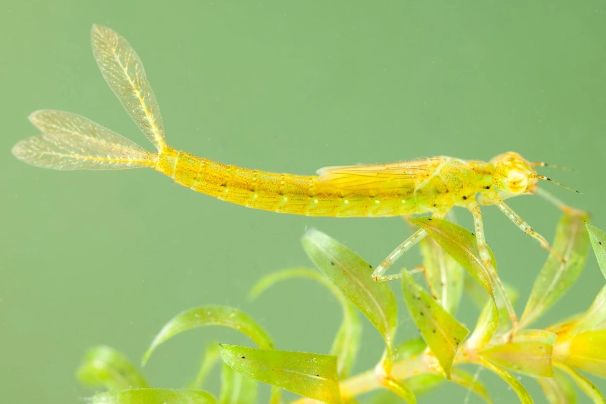 De larven overwinteren een of twee keer. Uitsluipen gebeurt in een relatief lange periode: van begin mei tot in augustus, met een piek in juni en juli. Larvenhuidjes tot enkele decimeters hoog op planten in de oever of op stengels van emerse vegetatie.