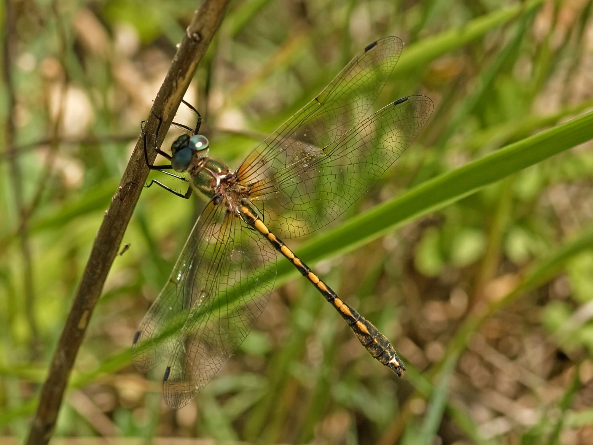 Lengte: 47-54 mm. Zeer slanke soort. Achterlijf donker metaalglimmend groen, met op de rug een reeks langwerpige gele vlekken. Borststuk metaalgroen met gouden glans. Ogen eerst dofbruin, later felgroen glimmend, sterk contrasterend met het donkere achterlijf. Voorhoofd zonder gele tekening. - Mannetje: achterlijf zeer slank, echter zonder duidelijke insnoering ter hoogte van segment 3. Een knotsvormige verbreding ver achteraan het achterlijf, breedste punt ter hoogte van segment 8. Bovenop segment 10 staat een klein, gelig kammetje (niet zichtbaar in vlucht). - Vrouwtje: achterlijf minder slank dan mannetje, maar slanker dan bij andere glanslibellen. Geen duidelijke knotsvormige verbreding. Vleugels vrij uitgebreid oranje getint.