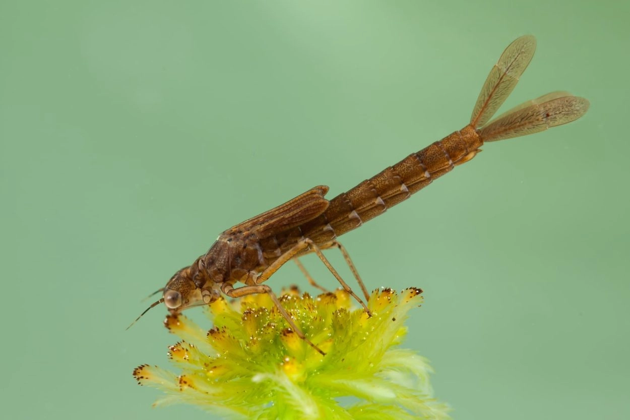 Lengte: 19 - 23 mm. waarvan de achterlijfaanhangsels, procten, 7 - 8 mm. De procten hebben een afgeronde uiteinde en geen bandering. De randen van het achterste (distale) deel van de procten zijn verdikt en dit deel is sterker beaderd dan het voorste (basale) deel. Ze hebben een niet-gesteeld kort en breed vangmasker, prementum