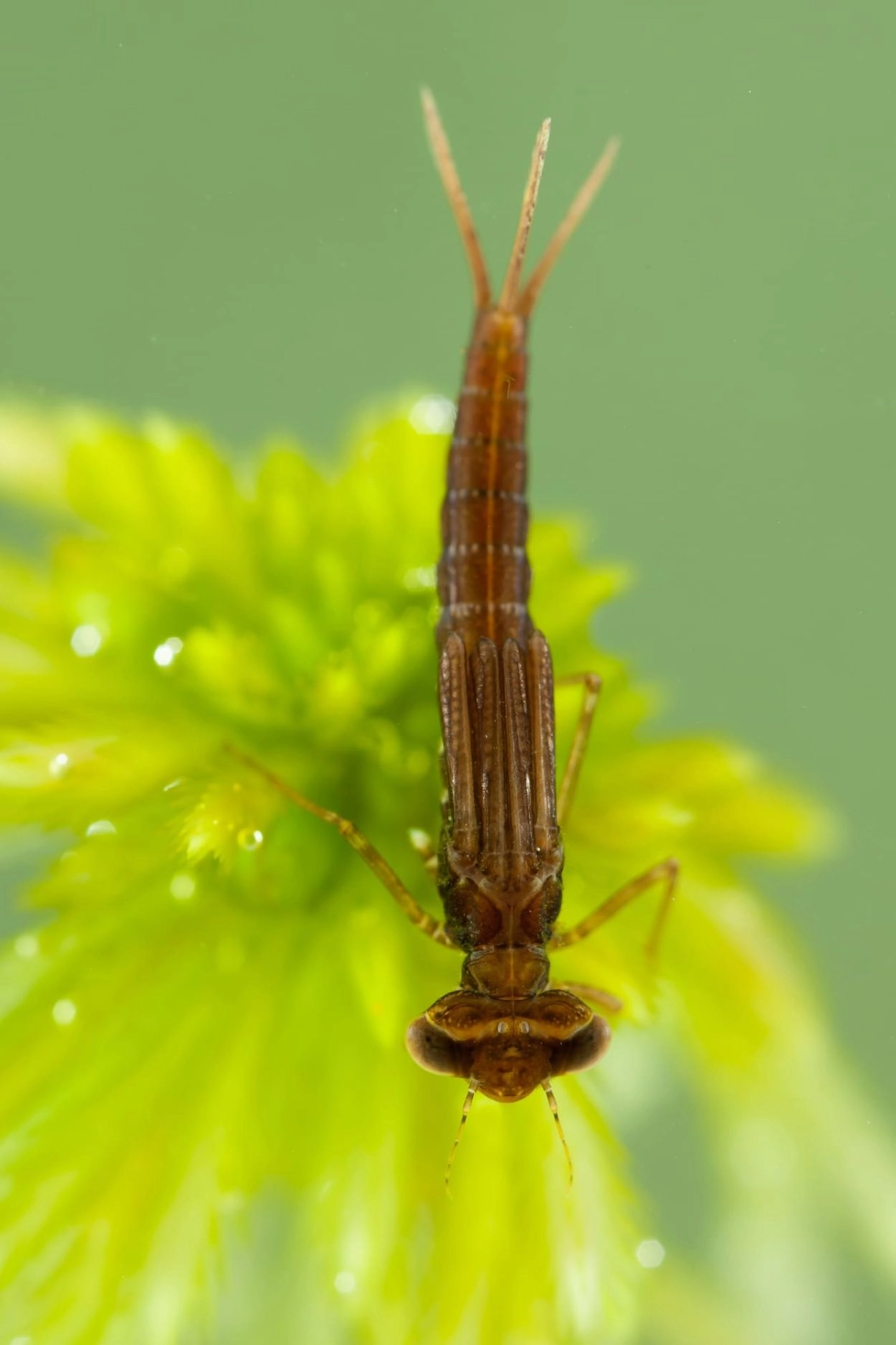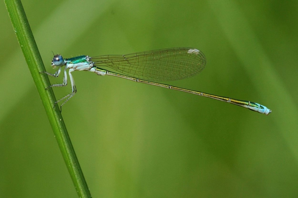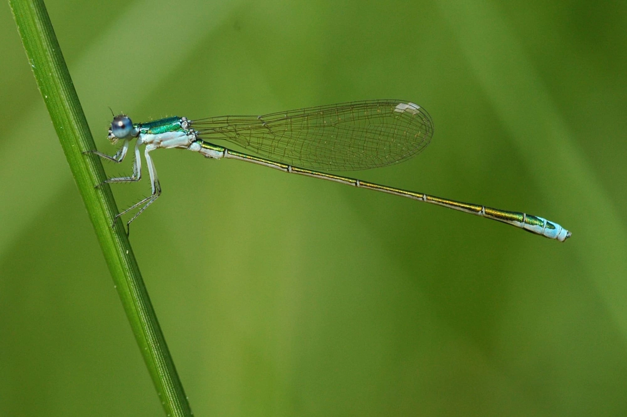 Lengte: 24-26 mm. Minuscule soort, de kleinste libel van Europa. Lichaam niet alleen kort, maar ook zeer dun. Vleugels naar verhouding kort. Achterlijf en borststukrug grotendeels metaalglimmend groen. Schouderstrepen meestal gereduceerd of afwezig. Bleke poten. Pterostigma’s eerst wit, later lichtgrijs. Achteroogsvlekken samengevloeid tot een gebogen streepje. - Mannetje: achterlijfsegment 10 blauw. Segmenten 8 en 9 ook grotendeels blauw, maar aan de zijkant van deze segmenten loop het metaalgroen van de rest van het achterlijf in een wigvorm door (zijaanzicht). Ogen aanvankelijk grijsblauw, later diepblauw. - Vrouwtje: jonge vrouwtjes zijn getekend zoals mannetjes, maar altijd herkenbaar door de aanwezigheid van een legapparaat. Bij oudere vrouwtjes worden de blauwe delen echter oranjebruin. Mannetje: bovenste achterlijfsaanhangelen als stompe, afgeronde uitstulpingen. Onderste achterlijfsaanhangsels vrijwel niet zichtbaar.
