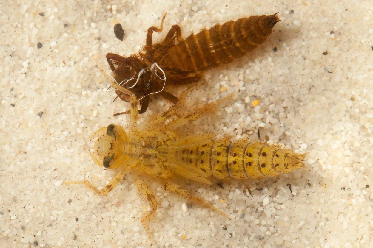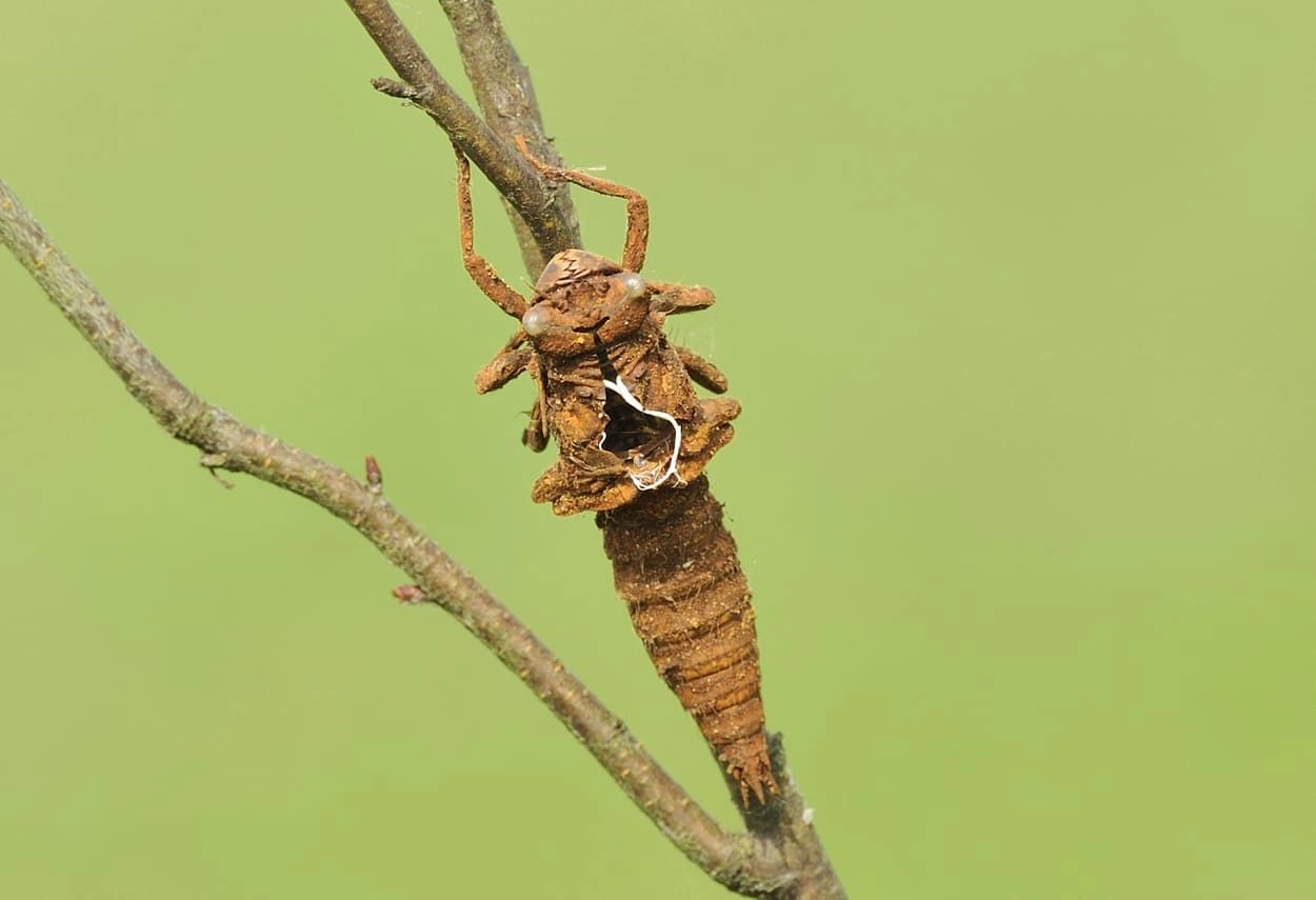 Lengte: 35 - 47 mm.Groot tot zeer grote larve. Labiale palp met karakteristieke diepe en onregelmatige tanden. Op de larvehuidjes zijn vaak de zijdoornen moelijk te zien doordat ze vaak aangekoekt zijn met modder en detritusdeeltjes.