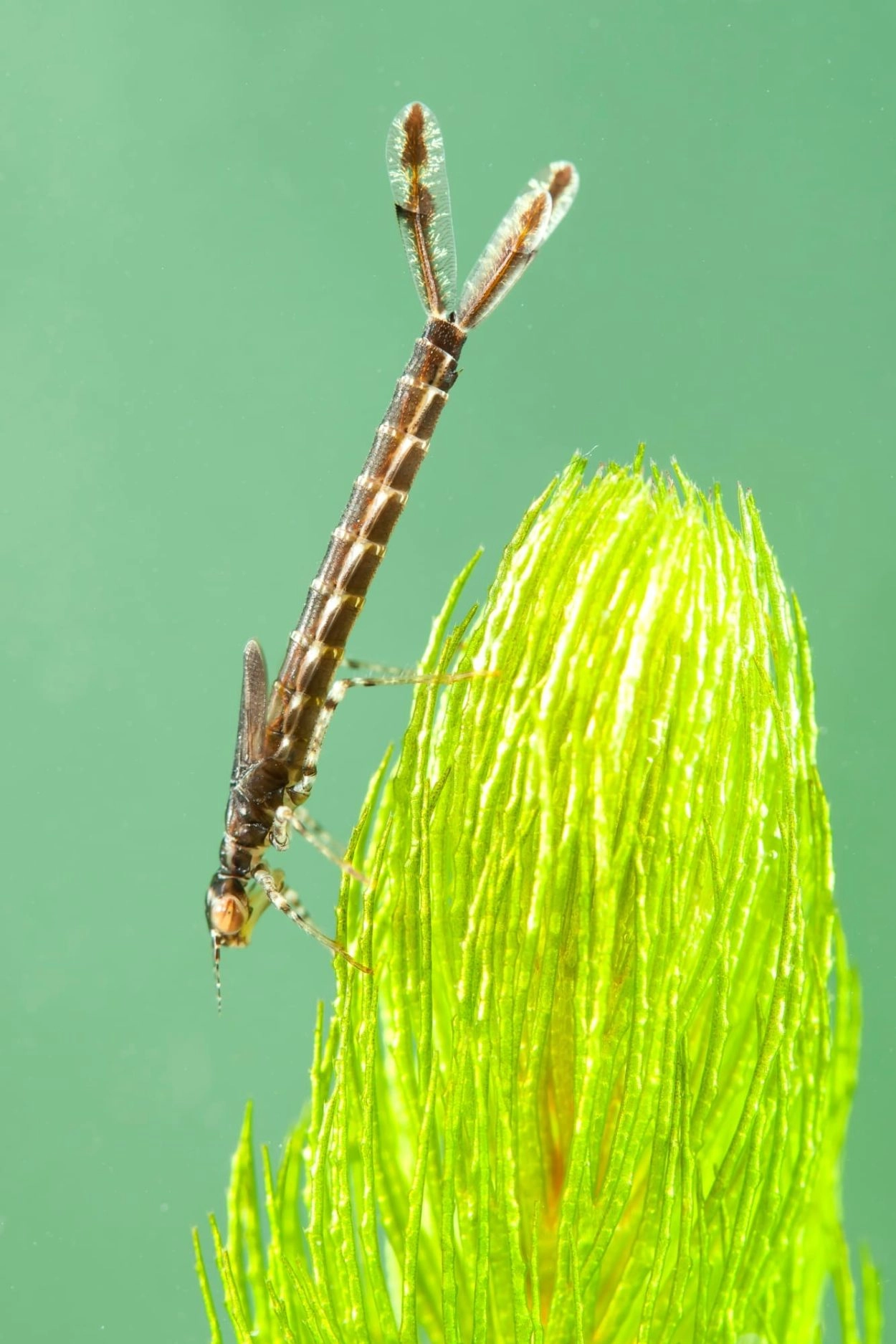De larven overwinteren een keer. Uitsluipen gebeurt vanaf half mei tot in augustus, met een piek in juli. Larvehuidjes zijn te vinden enkele centimeters hoog op stengels van oevervegetatie of emerse vegetatie, ook horizontaal op drijvende of net boven het water uitstekende vegetatie verder van de oever, of op stenen en kunstmatige substraten in de oeverzone."