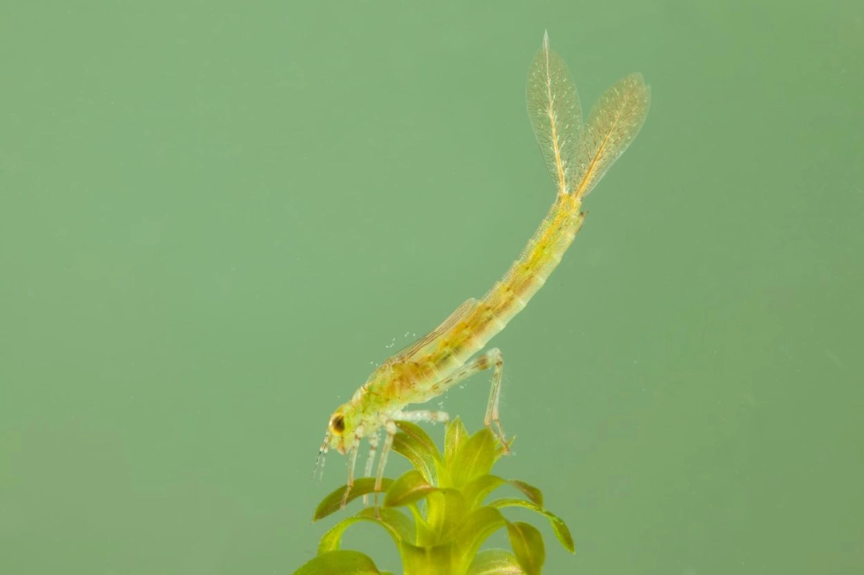 De larven overwinteren een, mogelijk soms twee jaar. Uitsluipen gebeurt van half juni tot begin september, maar vooral van half juli tot half augustus. Larvehuidjes zijn altijd dicht bij het wateroppervlak te vinden, soms verticaal op stengels van oevervegetatie of emerse vegetatie. Maar meestal zijn ze tevinden op drijvende of net boven het water uitstekende vegetatie verder van de oever.