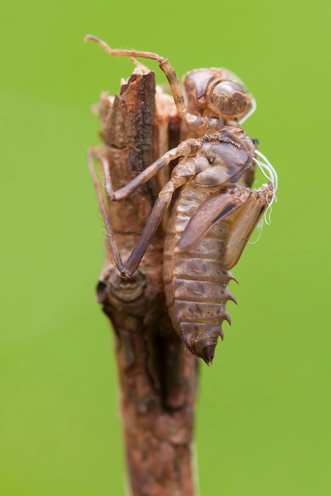 De larven overwinteren twee of drie keer, alvorens uit te sluipen. Uitsluipen gebeurt van begin mei tot eind juli. Larvenhuidjes zijn te vinden tot ongeveer een meter hoogte in de oevervegetatie. Incidenteel kunnen ze ook verder van het water gevonden worden en ook regelmatig onder bruggen.