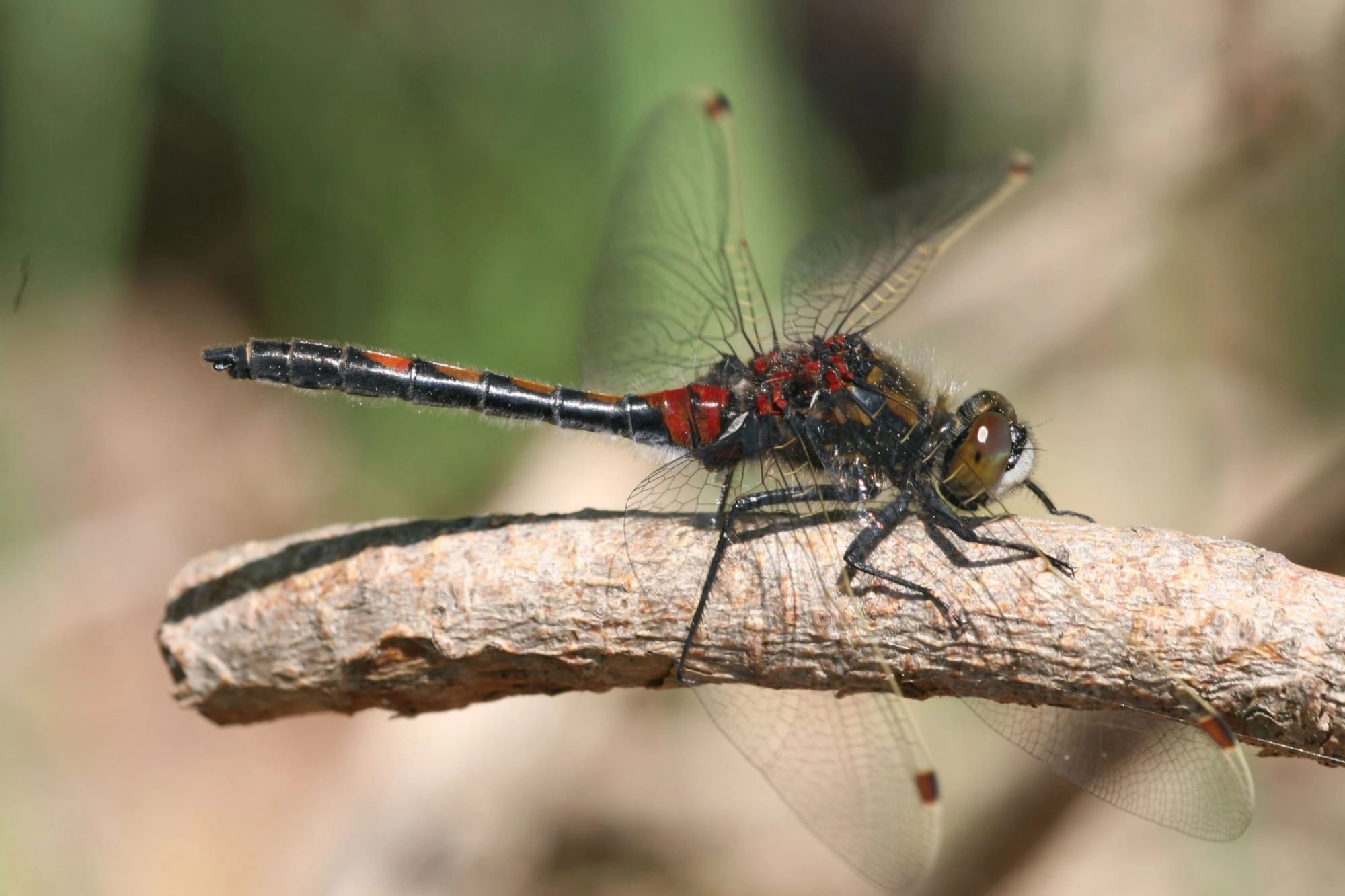 Lengte: 31-38 mm. Kleine soort, maar groter en vooral robuuster gebouwd dan de venwitsnuitlibel. Achterlijf zwart met lichtere vlekken (geel, rood of bruinrood, afhankelijk van geslacht en leeftijd). Voorrandader van de vleugels (in vooraanzicht bekijken): geheel geel gekleurd. Achterlijfsaanhangselen zwart. - Mannetje: uitgekleurde mannetjes zijn zwart met een rij rode vlekjes op het achterlijf. Bij oude mannetjes worden de vlekjes donker bruinrood. Pterostigma’s bruinrood, maar afhankelijk van waarnemingsafstand en lichtinval soms zwart lijkend. Jonge mannetjes hebben nog gele achterlijfsvlekken en zien eruit als vrouwtjes. - Vrouwtje: achterlijf zwart met vrij grote en brede gele vlekken. Pterostigma’s zwart, net als bij de meeste andere witsnuitlibellen. De vorm van de hamulus (mannetjes) en legschede (vrouwtjes) kan uitsluitsel geven bij het determineren van witsnuitlibellen. Het dier moet hiervoor echter worden gevangen en met een loep worden bekeken.