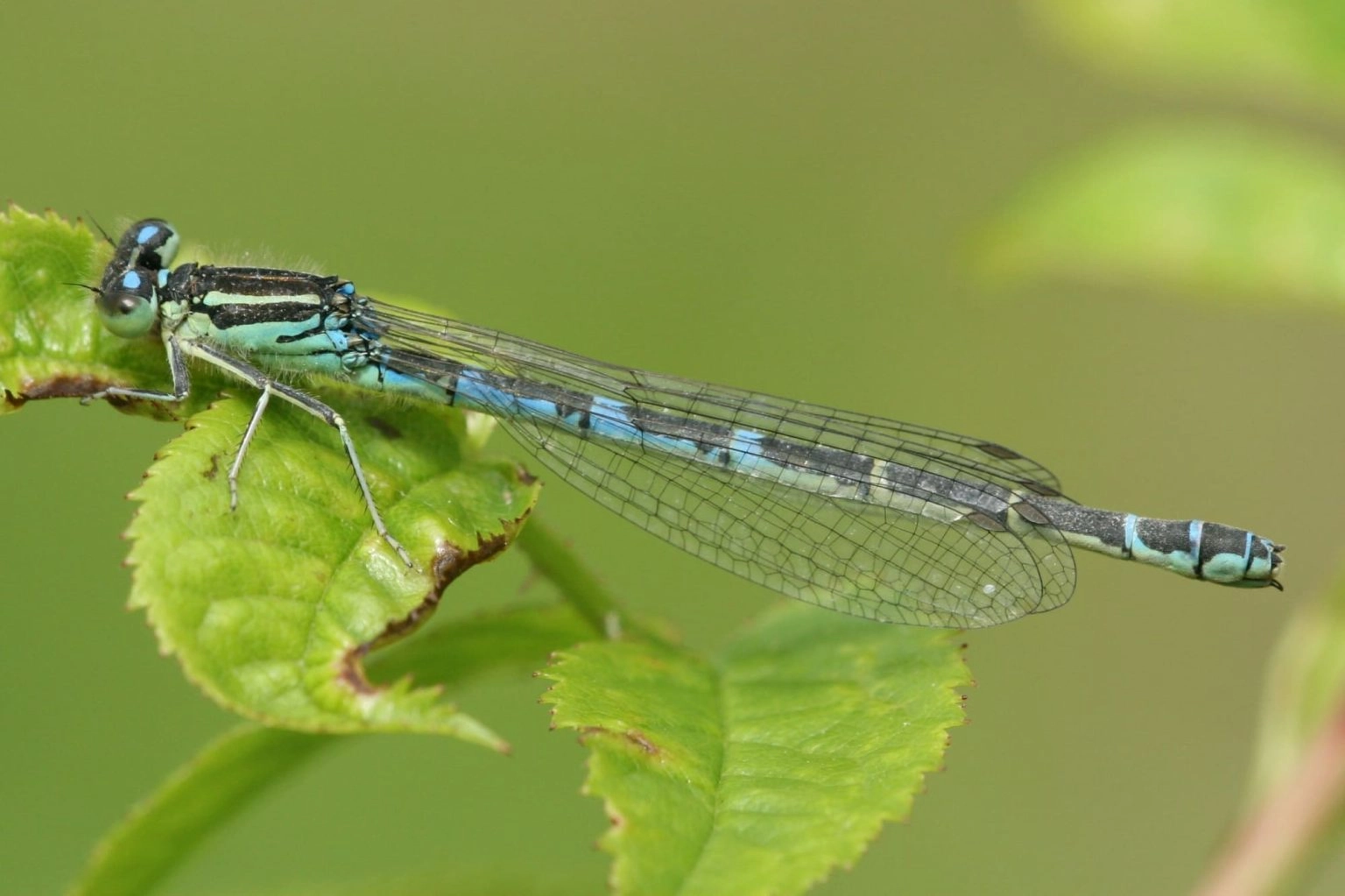 Lengte: 26-31 mm. Na dwergjuffer de kleinste soort. Pterostigma’s tweekleurig: donkere basis, lichte top. - Mannetje: pterostigma’s in voorvleugels duidelijk groter dan in achtervleugels. Achterlijf in bovenaanzicht donker, met segment 9 en top van 8 lichtblauw (het ‘lantaarntje’). In het blauw op segment 9 is vaak een fijne zwarte tekening aanwezig, die meer of minder uitgebreid kan zijn. Lichte delen van borststuk (zeer) lichtblauw of groen. - Vrouwtje: nooit met ‘lantaarntje’, bovenzijde segmenten 8 en 9 geheel donker. Jonge vrouwtjes zijn grotendeels fel oranje gekleurd: zijkant van borststuk, zijkant achterlijf, gehele achterlijfsegmenten 1 en 2, poten en enkele vleugeladers. De achteroogsvlekken zijn zeer groot en ook oranje. Schoudernaadstrepen zijn hooguit als dun zwart lijntje zichtbaar. De bovenzijde van achterlijfssegmenten 3 tot en met 10 zijn zwart. Later veranderen de vrouwtjes van kleur: het oranje verdwijnt en de donkere tekening breidt zich uit. Het achterlijf wordt geheel donker, de achteroogsvlekken worden iets kleiner en de schoudernaadstreep wordt duidelijker. De onderzijde van de ogen wordt groen. De overige lichte delen worden ófwel olijfgroen, ófwel blauw. De groene variant wordt bruin tot grijs bij ouder worden. De blauwe variant is zeldzamer dan de groene.