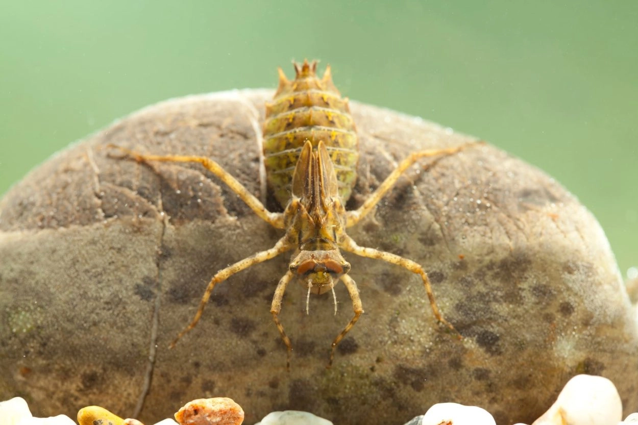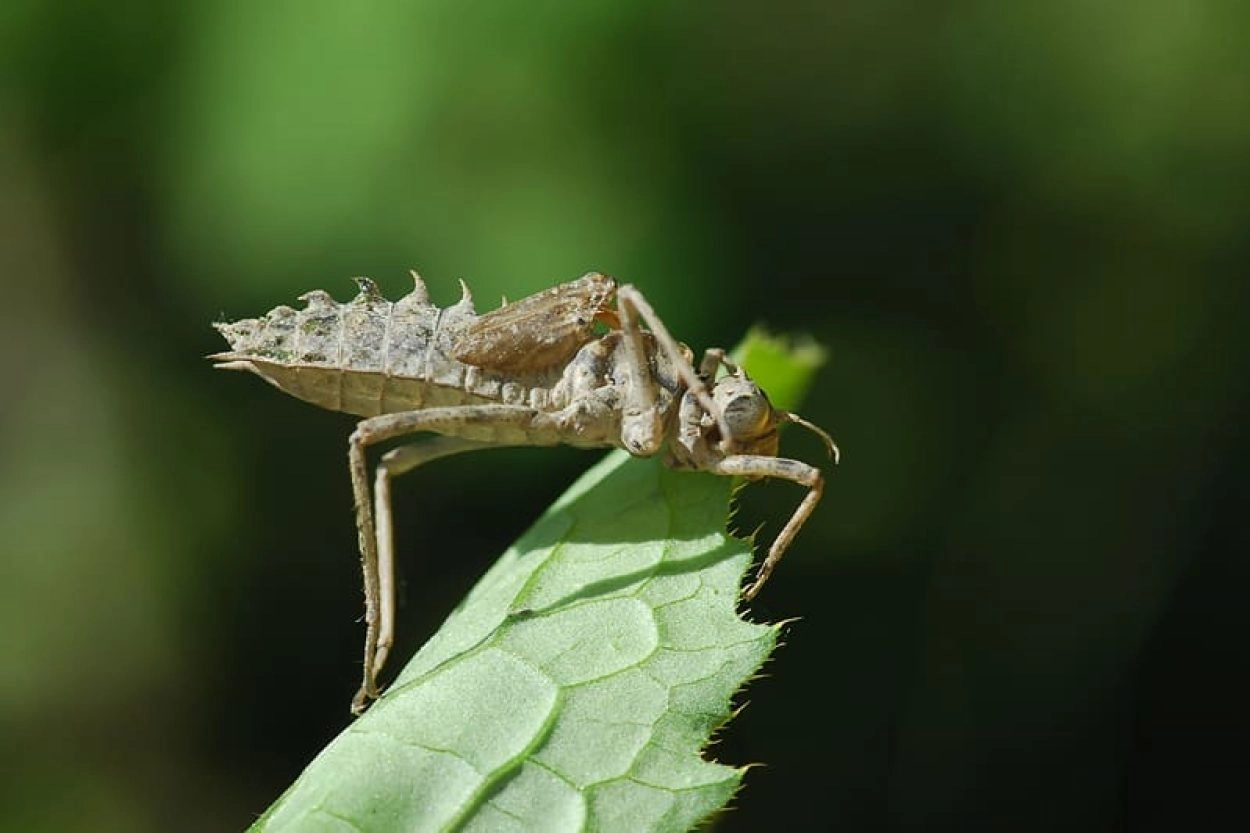De larven overwinteren twee of drie keer. Uitsluipen vindt in Centraal-Europa vrijwel uitsluitend plaats in mei. De larvenhuidjes zijn meestal in de oevervegetatie te vinden, varierend van enkele decimeters tot een meter hoogte, vaak aan de onderzijde van bladeren. Maar net als bij de smaragdlibel zijn sommige goede wandelaars en klimmers en kunnen soms hoog in bomen of tientallen meters van de waterkant gevonden worden.