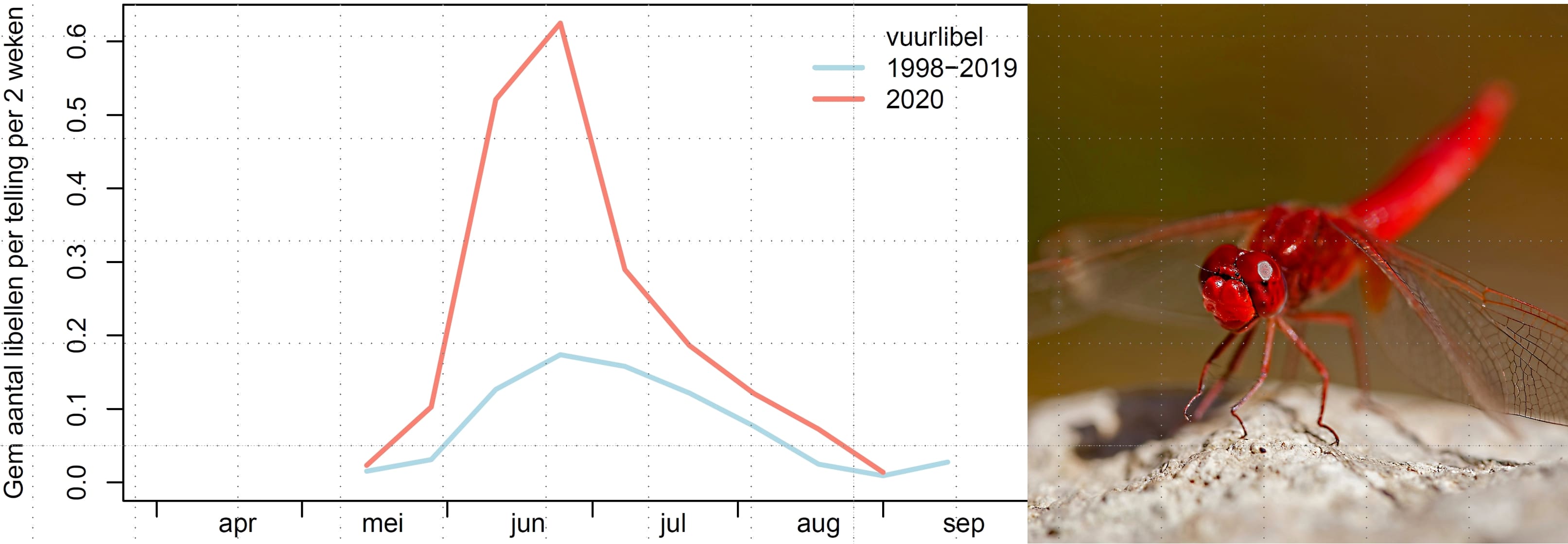 Gelukkig zijn er ook soorten die hitte en droogte prima vinden. De zuidelijke soorten, die een mediterraan klimaat gewend zijn, deden het wel erg goed dit jaar. Zo waren er flink wat tengere pantserjuffers en zuidelijke heidelibellen, en ook de zuidelijke glazenmaker werd op veel plekken gezien. Er waren ook veel waarnemingen van de zuidelijke keizerlibel, waarvan op veel plaatsen paring en ei-afzet werd gemeld. Dit geeft aan dat ze zich op die plek probeerden voort te planten. Een andere soort, die het al jaren prima doet, is de vuurlibel. Ook dit is een soort die in Zuid-Europa veel voorkomt en dus is aangepast aan warme en soms droge situaties. Er waren plaatselijk ook flink wat geelvlekheidelibellen, de laatste jaren een erg zeldzame soort. Het waren echter nog steeds erg lage aantallen vergeleken met de grote invasies die we in het verleden hebben gehad. Kortom: het was een zeer matig libellenjaar waarin een paar soorten, die van warmte houden, wel goed vlogen.