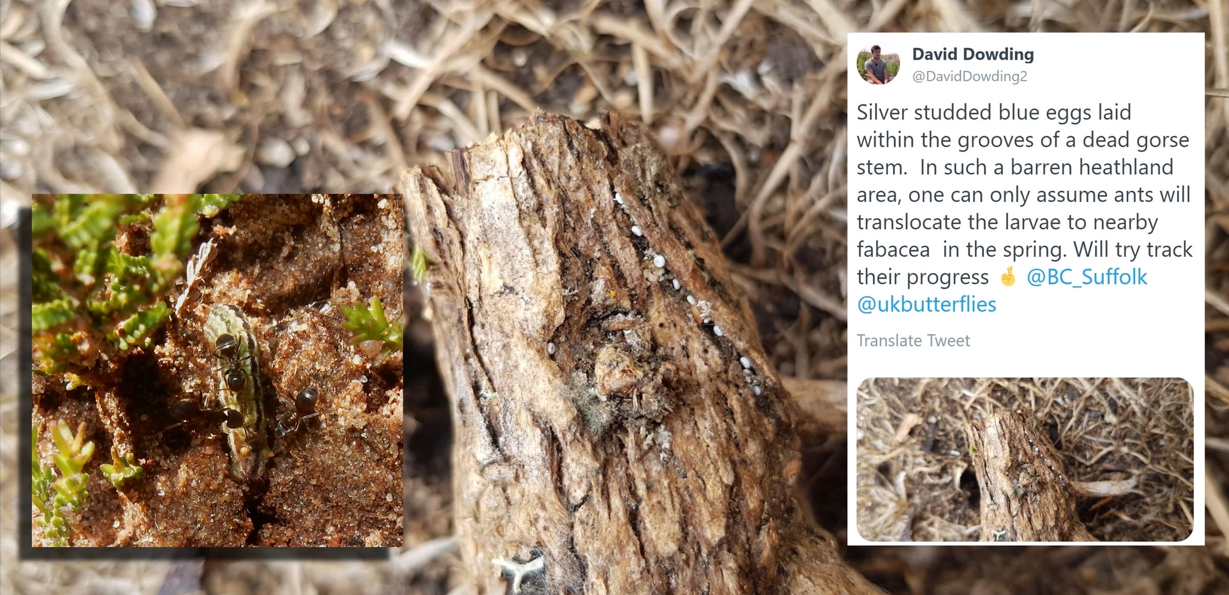 De foto op Twitter van David Dowding laat eitjes van het heideblauwtje zien die in de spleet van een dode boomstronk zijn gelegd. Dat is bijzonder, want we gaan ervan uit dat de eitjes steeds op, of in de directe omgeving van de plant worden afgezet waar de rups ook van kan eten. In Nederland is dat vooral struikhei, maar ook wel dophei. De eitjes overwinteren en in het voorjaar vanaf half maart komen de rupsen uit en eten van de jonge uitlopers van de waardplant. Maar die rupsjes die op de boomstronk uitkomen hebben geen schijn van kans. Zo’n jong rupsje van anderhalve millimeter kan niet meters kruipen naar de dichtstbijzijnde heideplant. Is dit een vergissing en heeft dit vrouwtje eitjes afgezet die ten dode zijn opgeschreven? Dat is niet waarschijnlijk en nu begint de speculatie, maar wel onderbouwd met kennis van de samenwerking die bestaat tussen blauwtjes en mieren. Het is bekend dat sommige rupsen van heideblauwtjes worden meegenomen door mieren en zich verpoppen in het mierennest. Rupsen die niet door mieren worden meegenomen verpoppen zich in de strooisellaag of in de grond.