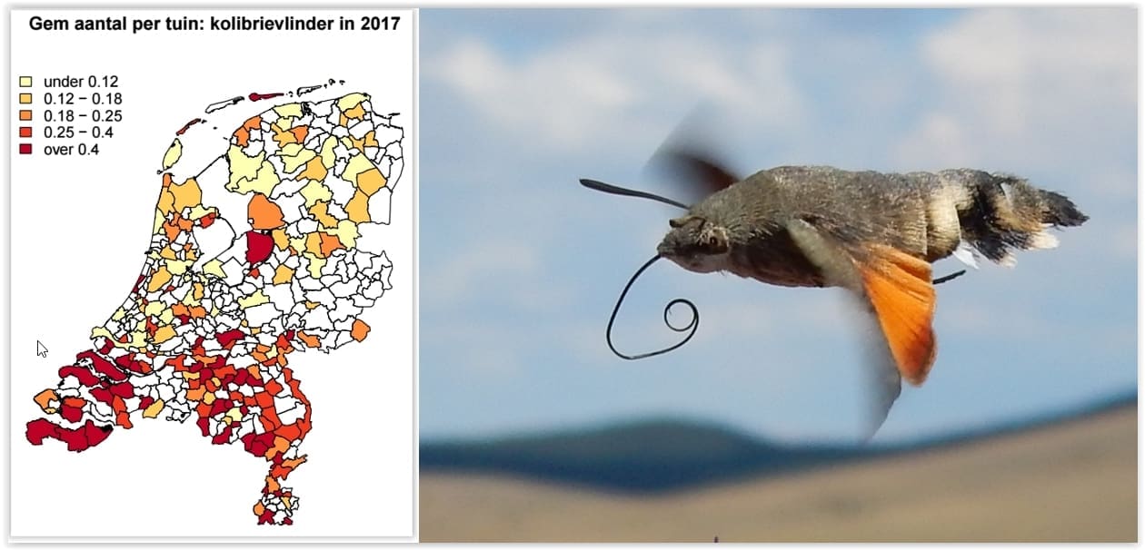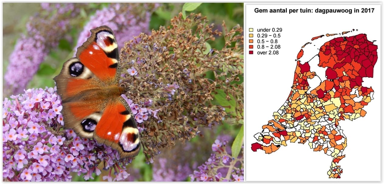 Inmiddels zijn er van ruim 4200 tellingen gegevens binnen en dat is wat minder dan de afgelopen jaren. Voor een belangrijk deel is dit te verklaren door het bewolkte weer op zaterdag. Toen zijn er maar iets meer dan 500 tellingen uitgevoerd. In het zuidoosten was de bewolking het meest hardnekkig en dat is terug te zien in het aantal tellingen. In het westen van het land was de zon het meest te zien. Op zondag werden veel meer tuinen geteld. Toen het in een groot deel van het land veel zonniger was. De atalanta is het meest geteld, net als de afgelopen twee jaar. De kleine vos was nummer twee en op drie stond de dagpauwoog. Die derde plek had deze echte tuinvlinder vooral te danken aan het noorden van het land, wat daar was hij nog volop aanwezig, terwijl hij in de zuidelijke helft veel minder werd geteld. Door het warme weer eerder dit jaar vlogen de meeste soorten weken eerder dan in andere jaren. Een aantal typische tuinsoorten, zoals de kleine vos en de dagpauwoog hadden hun landelijke piek een week of twee geleden en werden daarom in deze tuinvlindertelling minder gezien dan andere jaren. Ook de koolwitjes waren duidelijk minder aanwezig.