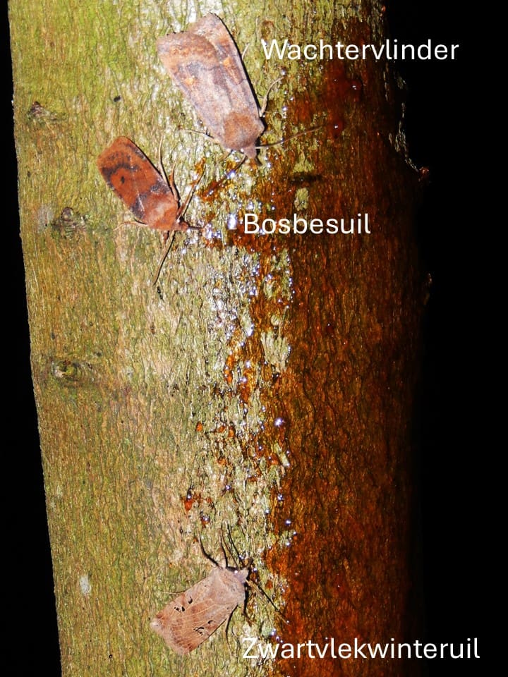Regelmatig, schrijf ik hierboven, want het is zeker niet altijd prijs. Er zijn avonden dat ik smeer op honderd bomen en dan blij ben dat ik na de controle twee of drie vlinders heb gezien. Er zijn ook avonden dat ik op evenveel bomen meer dan 150 vlinders aantref. Succes is dus zeker niet gegarandeerd en na een teleurstellende ervaring moet je je niet af laten schrikken, maar het gewoon nog een aantal keer proberen. Op dit moment kun je bij het stropen in niet te koude nachten rekenen op de volgende soorten die redelijk verspreid over het land voorkomen: zwartvlekwinteruil, wachtervlinder en bosbesuil. Maar er zijn nog meer uilen actief nu, al is de trefkans voor die soorten wel wat kleiner. Op de hogere zandgronden en in de duinen zul je meer vlinders lokken dan in de kleigebieden, maar ook daar zijn ze aanwezig. Stropen op donderdagavond 15 januari in de Betuwe leverde op negentig bomen acht bosbesuilen, zeven wachtervlinders en een zwartvlekwinteruil op.