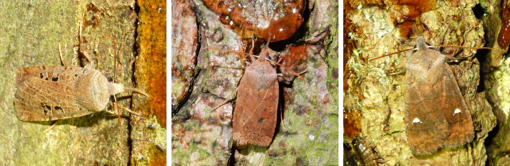 Er zijn nachtvlinders – vooral van de familie van de uilen – die je ook in januari kunt vinden, maar deze moet je wel lokken. Door te stropen of smeren kun je ze te zien krijgen. Stropen houdt in dat je rond zonsondergang een zoete stof in kleine plekjes op bomen aanbrengt. Vanaf een uur na zonsondergang kun je die plekken voorzichtig controleren met een zaklamp en dan kun je daar nu, half januari, een soort of vijf op aantreffen. Het is vooral belangrijk dat het smeer zoet is – dus veel suiker is een vereiste – maar over de precieze ingrediënten heeft iedere vlinderaar haar of zijn eigen ideeën. De een zweert bij overrijpe bananen, er zijn er die absoluut appelmoes erin willen hebben en een ander staat erop dat er flink wat alcohol wordt toegevoegd. Ook met een heel simpel recept, rode wijn met suiker, kun je al succes hebben. Deze vloeibare massa kun je met een plantenspuit eenvoudig aanbrengen op de bomen. Ikzelf werk altijd met het recept dat je op onze site kunt vinden; daarmee heb ik regelmatig groot succes.