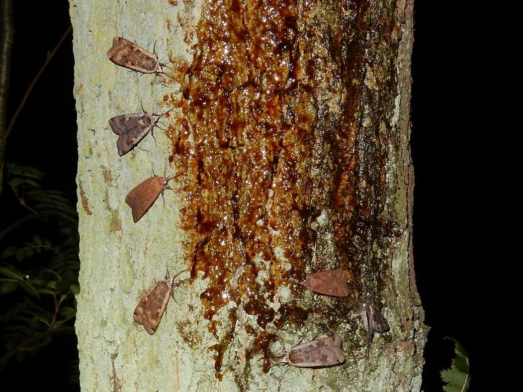 Een andere manier is stropen of smeren. Dan smeer je een zoete substantie met wat alcohol op een boom en nachtvlinders komen daarop af en zuigen met hun lange roltong van de heerlijke zoetigheid. Mensen denken weleens dat die vlinders aan de stroop vast plakken, maar dat is niet het geval. Ze weten precies wat ze doen en vliegen, na de heerlijke maaltijd, gewoon weer weg.