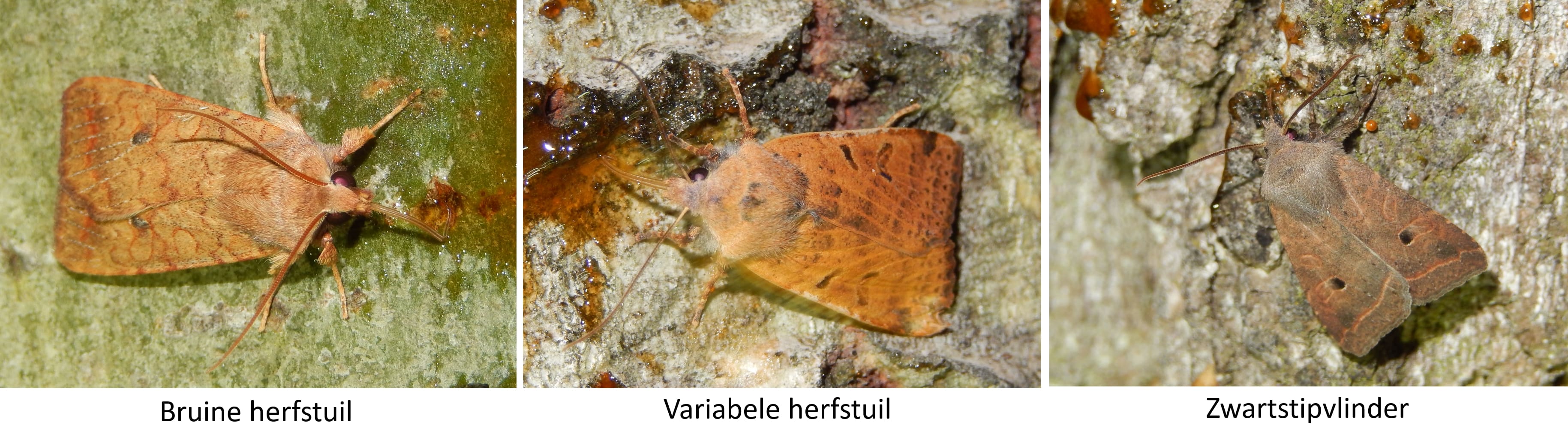 Er zijn nog tientallen nachtvlinders actief zo laat in het jaar, maar niet allemaal laten ze zich aanlokken. De herfstuilen zijn wel echte zoetekauwen en deze kun je nu en de komende weken dus in je tuin verwachten als je zorgt dat daar bloeiende planten staan. Er zijn vier soorten die redelijk algemeen voorkomen en die je in vrijwel het hele land te zien kunt krijgen. De twee meest talrijke zijn de bruine herfstuil en de zwartstipvlinder. Deze lijken wel wat op elkaar: bruin met een rood lijntje langs de achterrand van de vleugel. Bij zwartstipvlinder is die rand vrij recht, bij de bruine herfstuil is het een beetje geschubd lijntje. Naast de twee genoemde soorten kunnen ook geelbruine– en variabele herfstuil worden gezien en er zijn nog tientallen andere vlinders actief. Naar buiten dus en met de zaklamp de tuin in, of smeer’m!