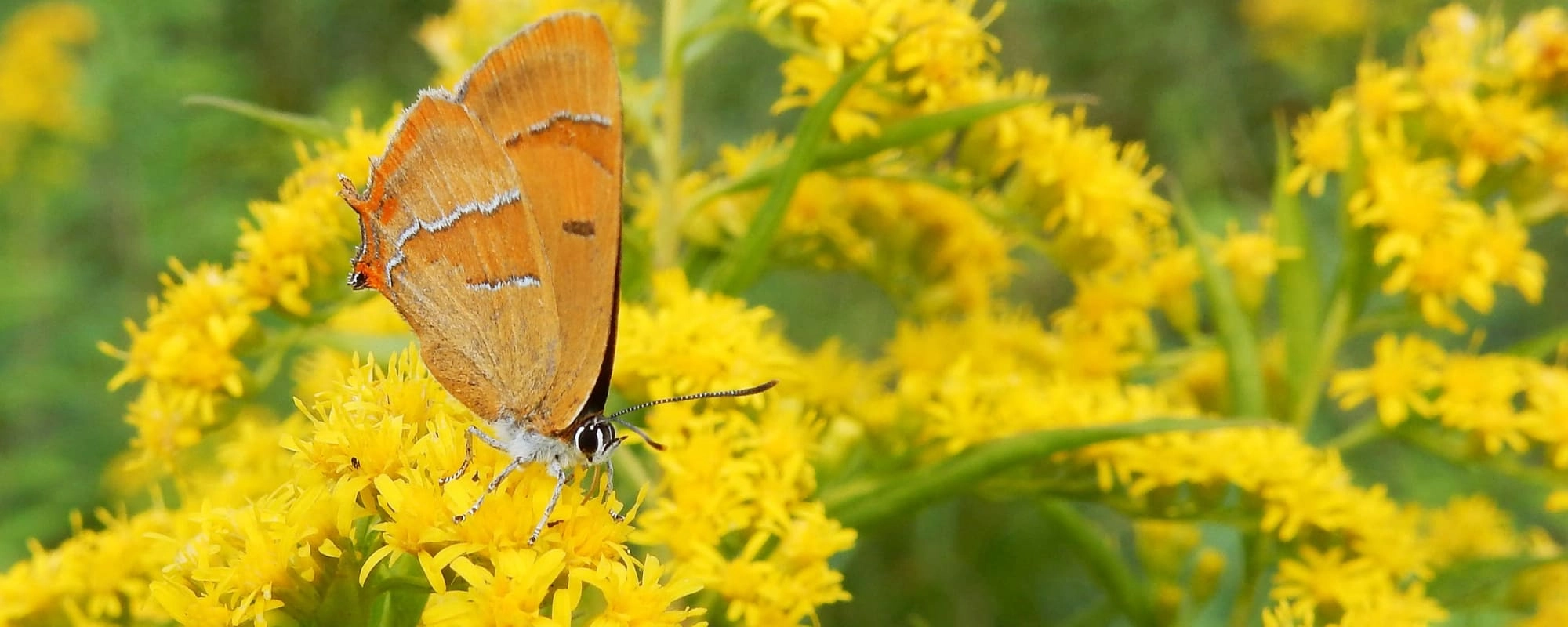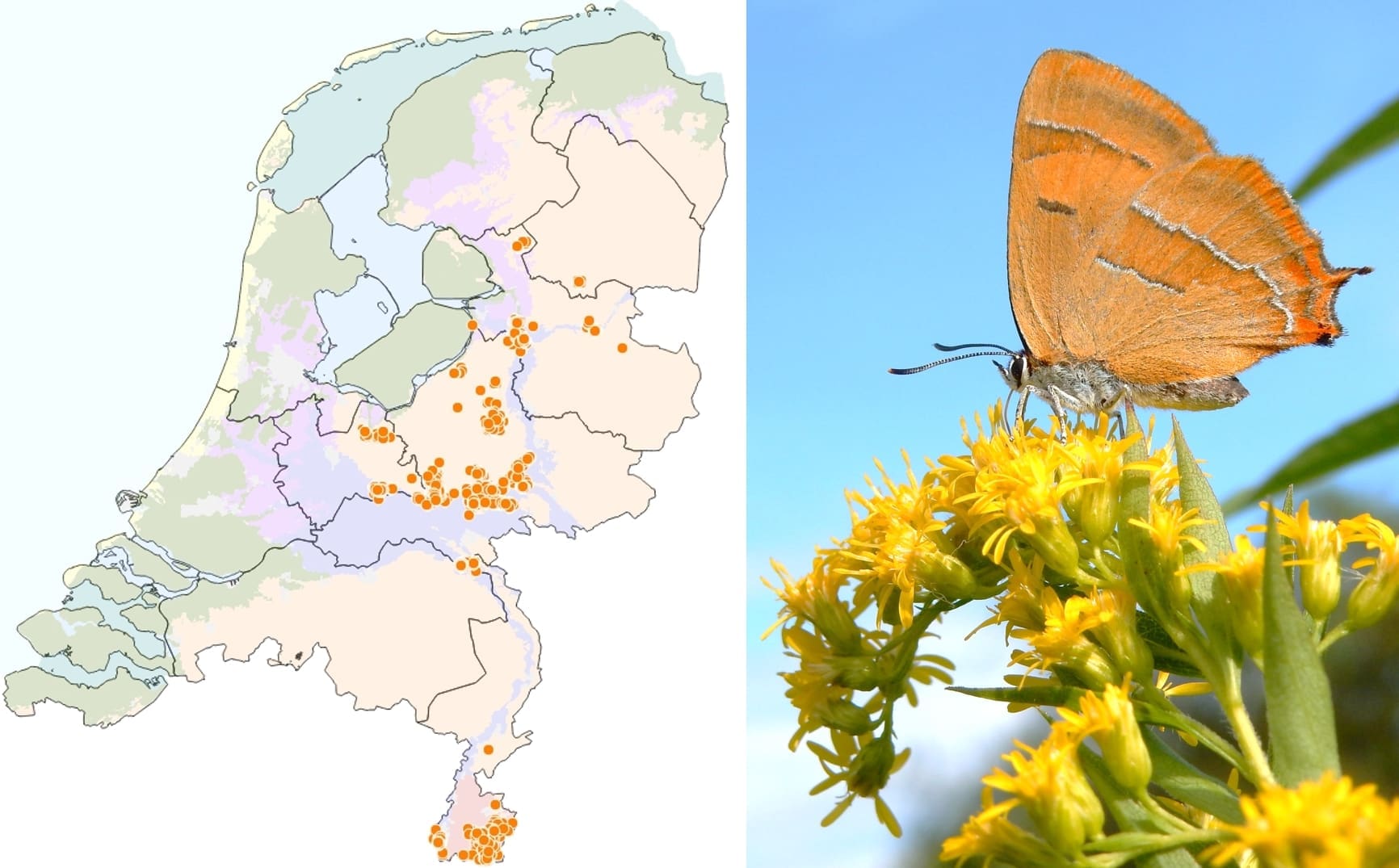 Meestal zitten sleedoornpages met gesloten vleugels, maar deze laat de voor vrouwtjes kenmerkende oranje vlekken op de bovenzijde zien (foto: Kars Veling)