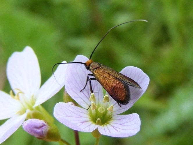 Als je nu in het voorjaar, bij het zoeken naar de oranjetipjes op de pinksterbloemen, goed oplet kun je ook de pinksterbloemlangsprietmot (Cauchas rufimitrella) tegenkomen. Dit is een heel algemene soort die door heel Nederland voorkomt, maar toch altijd leuk om te vinden. Ze zijn maar klein, met een spanwijdte van negen tot twaalf millimeter. Deze soort heeft echt lange sprieten. De sprieten van de mannetjes zijn tot wel twee keer zo groot als de lengte van de voorvleugel, die van de vrouwtjes zo’n anderhalf keer.