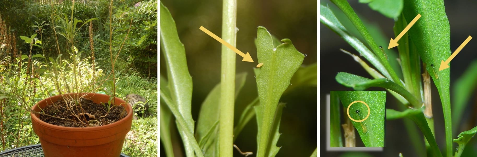 Tot een jaar of twintig geleden was het scheefbloemwitje een weinig voorkomende vlinder. Plaatselijk in de Alpen en de Provence waren er vliegplaatsen, maar ‘plotseling’ gingen scheefbloemwitjes zwerven en schoven ze vijftig tot honderd kilometer per jaar op naar het noorden. Klimaatverandering kan hier een rol in hebben gespeeld, maar er was ook een genetisch verschil tussen de blijvers en de zwervers. Zoals de naam al doet vermoeden is scheefbloem (Iberis spec.) de waardplant waar de rupsen op leven. In de Alpen en de Provence is dit de enige waardplant, maar de rupsen van de zwervers bleken ook allerlei andere kruisbloemigen te kunnen eten. Zo worden grote zandkool (Diplotaxis tenuifolia), ook wel wilde rucola genoemd, en look-zonder-look (Alliaria petiolata) vermeld. In onze tuin staat al een aantal jaren scheefbloem (speciaal voor dit witje) en het scheefbloemwitje heeft zich daar ook al een aantal malen op voortgeplant. Deze nazomer stond er ook een potje met grote zandkool op de tuintafel en daar werden meer dan twintig eitjes op afgezet door meerdere vrouwtjes van het scheefbloemwitje. De scheefbloem werd veel minder bezocht.