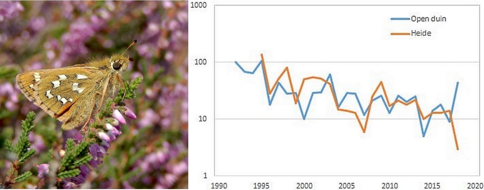 Tijdens de hete en droge zomer van 2018 hadden de vlinders van de hei het moeilijk. Deze vlinders vliegen laat in het jaar, om te kunnen profiteren van de bloeiende heide waar ze veel nectar uit kunnen drinken. Die nectar is nodig om actief te kunnen zijn en zich voort te planten. Vorig jaar bloeide er echter maar heel weinig heide. Een deel was helemaal dood; een ander deel leefde nog wel, maar bloeide niet of nauwelijks.